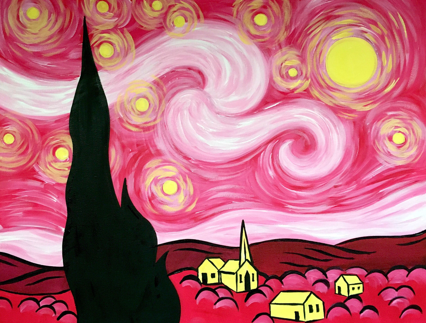 This is a simplified version of Vincent Van Gogh’s Starry Night, but we’re using pink instead of blue! We experiement with signature Van Gogh brush strokes to create a swirling bubblegum sky. We have a soft field of pink grass with cute little houses and a church.