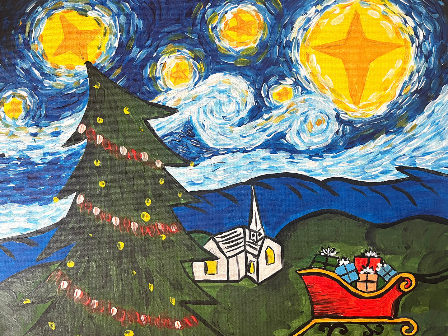 This Christmas themed painting is inspired by Van Gogh's iconic painting "A Starry Night".