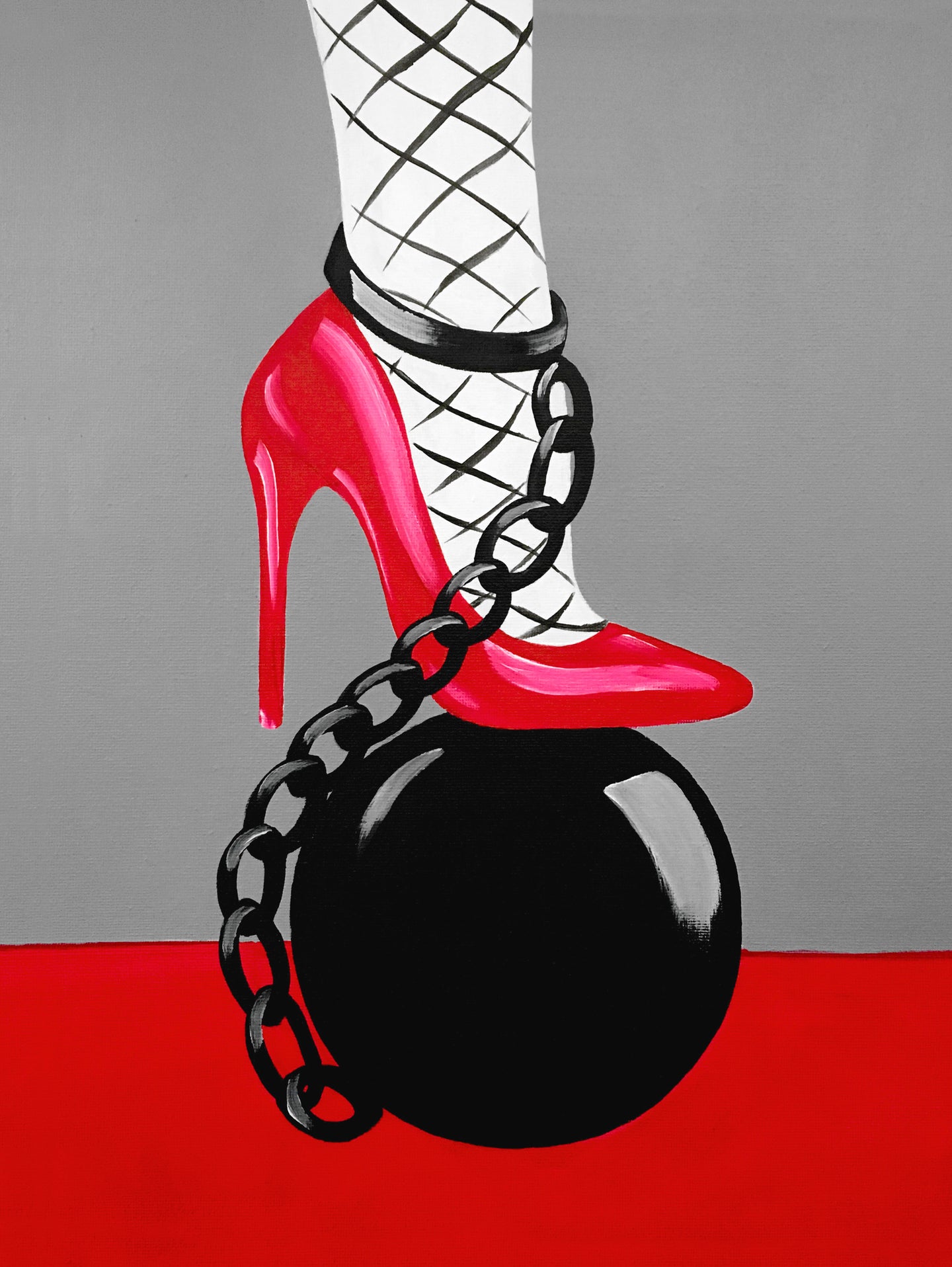 This painting clearly shows who's in charge! This Ball and chain painting uses modern colours and is an illustrative style. A great painting for Hen's parties or for a wild night out with lots of laughs.