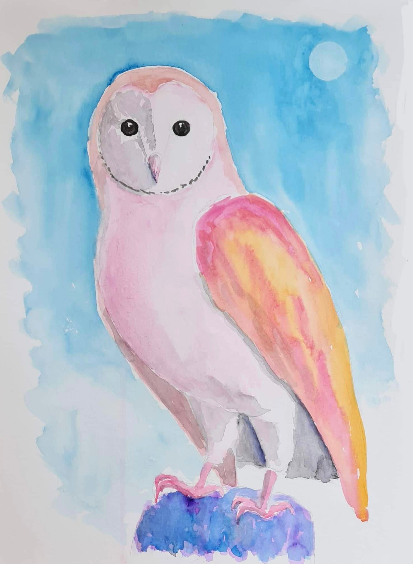 This illustration of a barn owl uses washes of colour to create a loose textured looking effect. A helpful hint for any painting of animals: the larger the eyes, the younger and cuter your own will look. The smaller the eyes, the older are wiser!