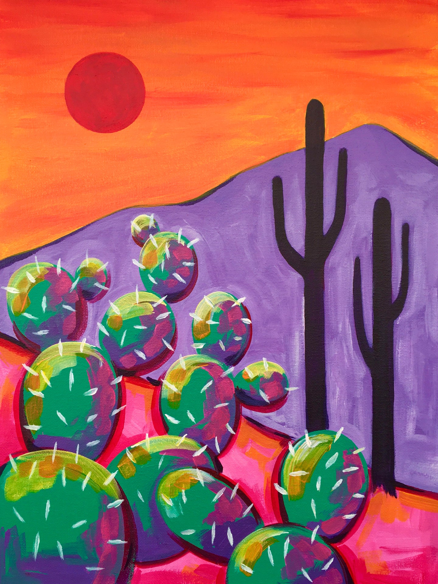 It's getting hot in here! This scene captures the essence of a late summer evening with cacti in a valley, showcasing gorgeous warm tones and a variety of painting methods.