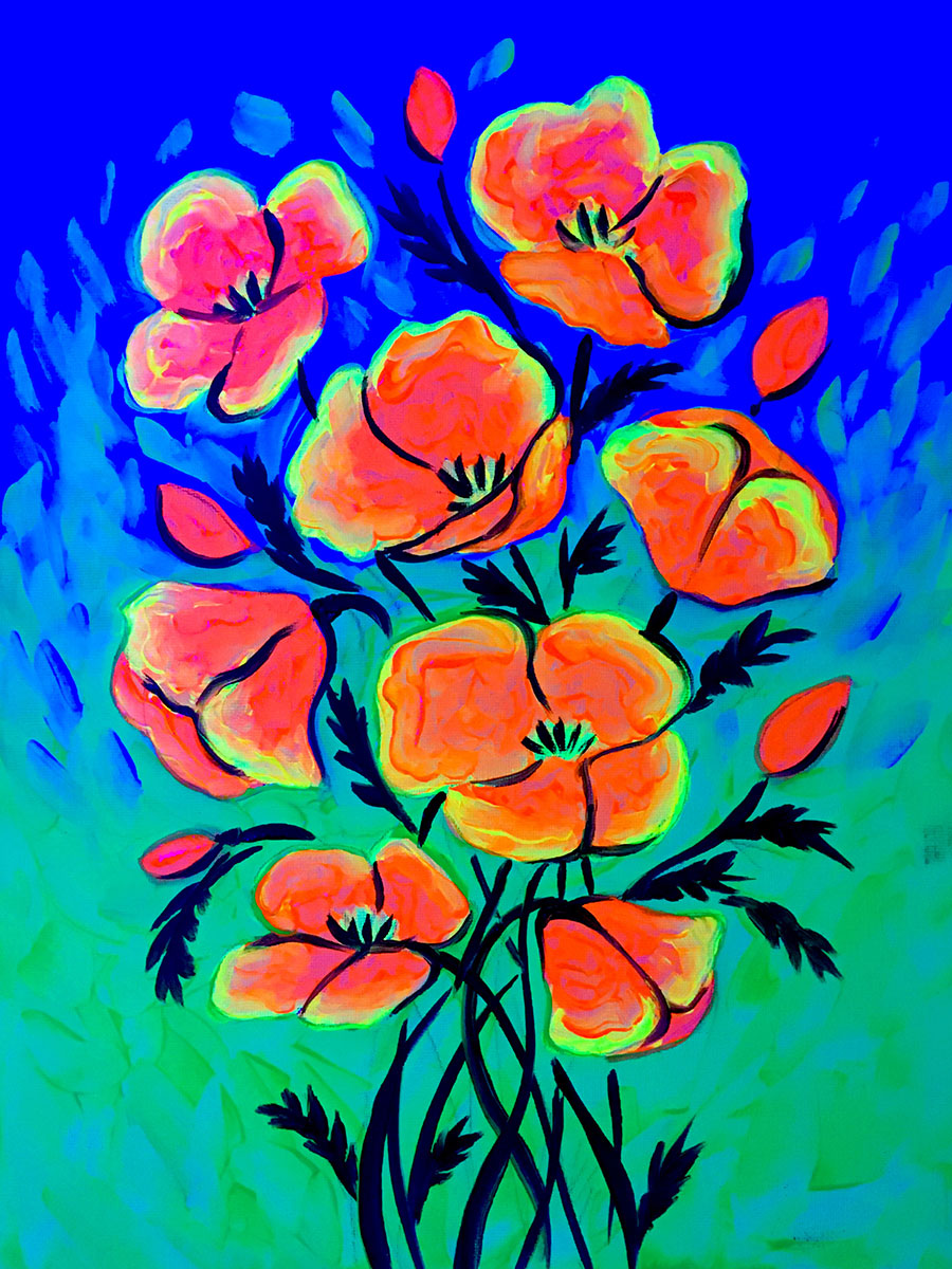 Create a vibrant, glow-in-the-dark masterpiece with this California Poppies painting! Using loose brush strokes and swirling colours, you'll bring these poppies to life under UV lights, adding a neon twist to your art. Perfect for a fun, creative night out!