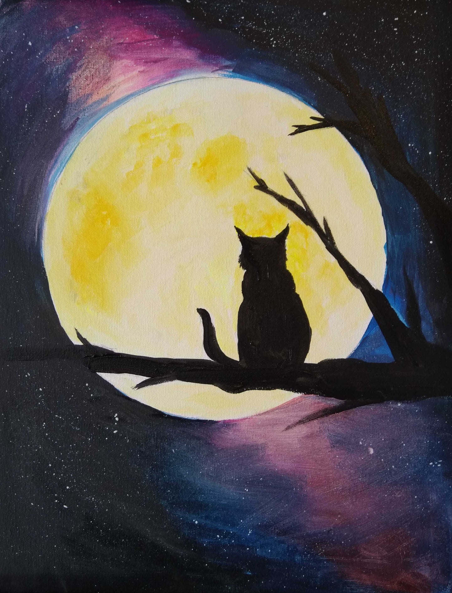 This art work incorporates a composite of techniques, including blending, flicking, and meticulous strokes to render key shapes. It showcases a cat in deep thought as it gazes at the moon. Pro tip...ask your artist for a clean paper plate to trace the moon!