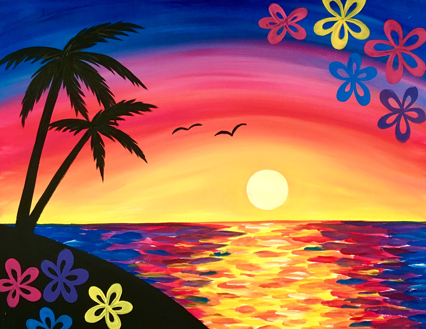 Here we have a brightly coloured rainbow sunset in the tropics, with stylised flowers for decoration. This painting involved a lot of blending, and is a lot of fun!