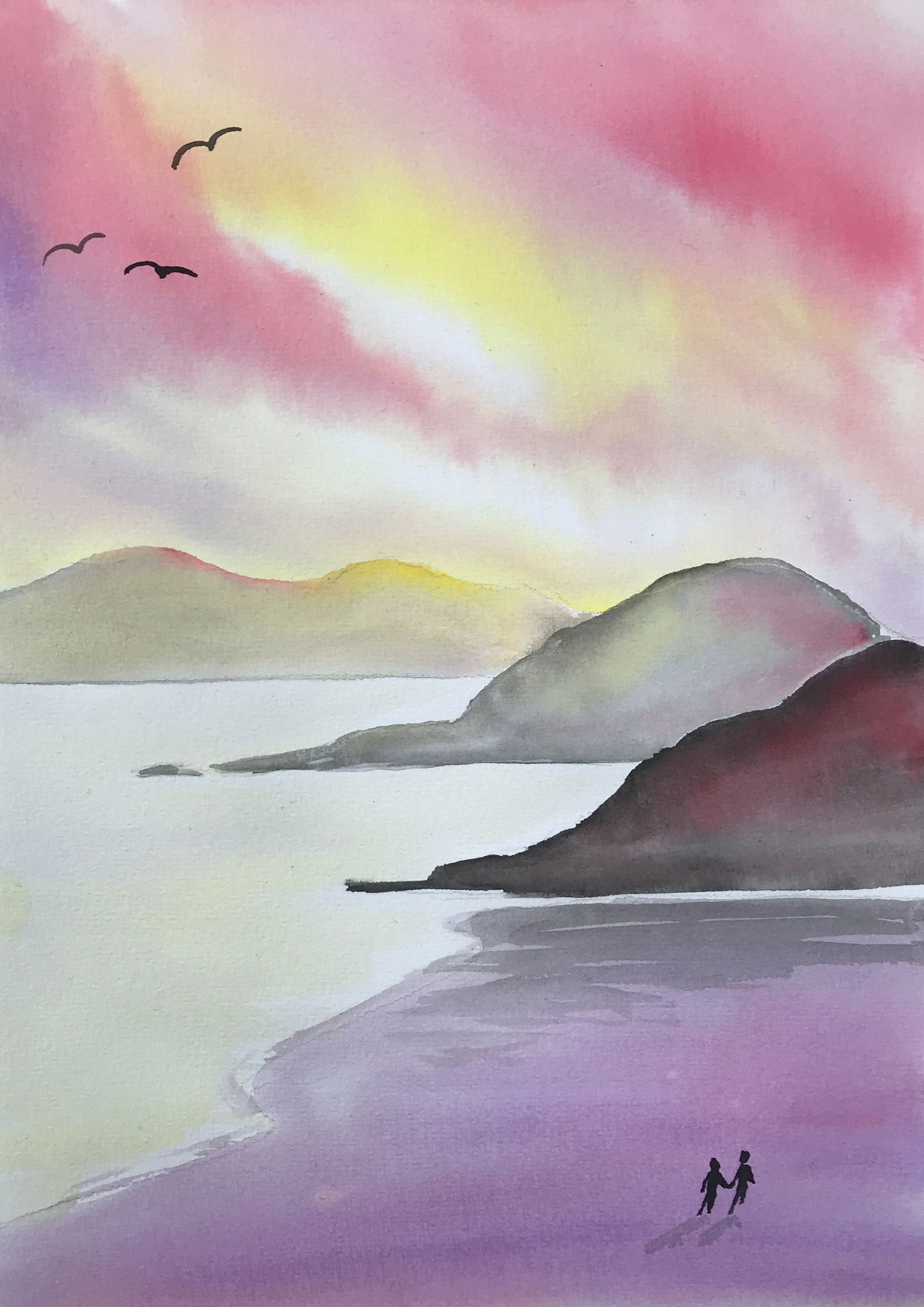 This painting captures a morning sunrise in shades of pink, yellow and purple. We will show you how to carefully control your paint and water to create a beautiful sky.