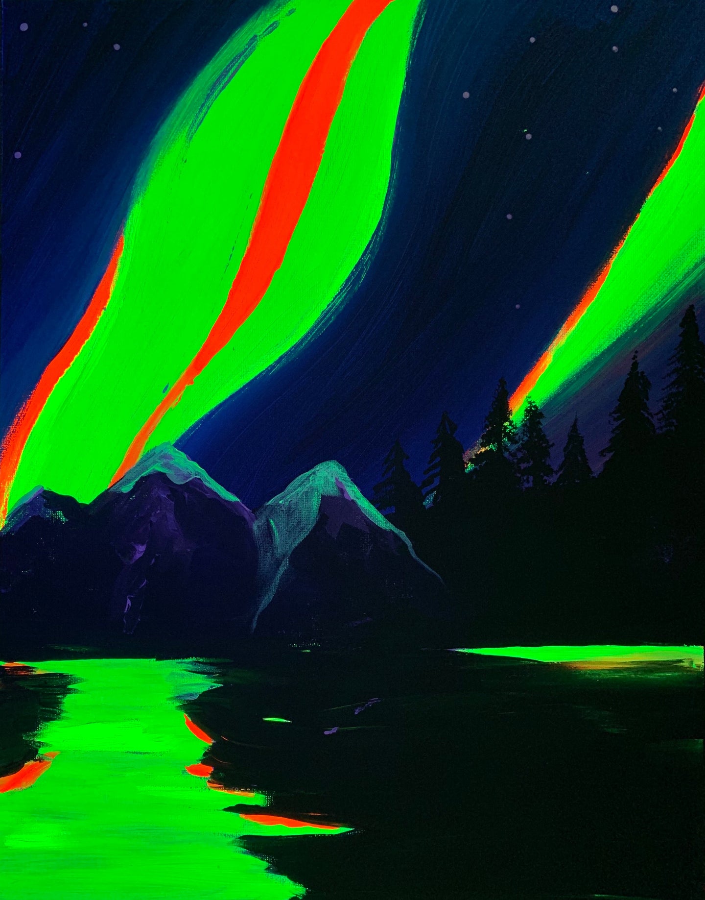 The Northern lights (aurora borealis) are perfect to paint with glow in the dark paint. The neon greens capture the electric imagery of swaying lights in the sky.