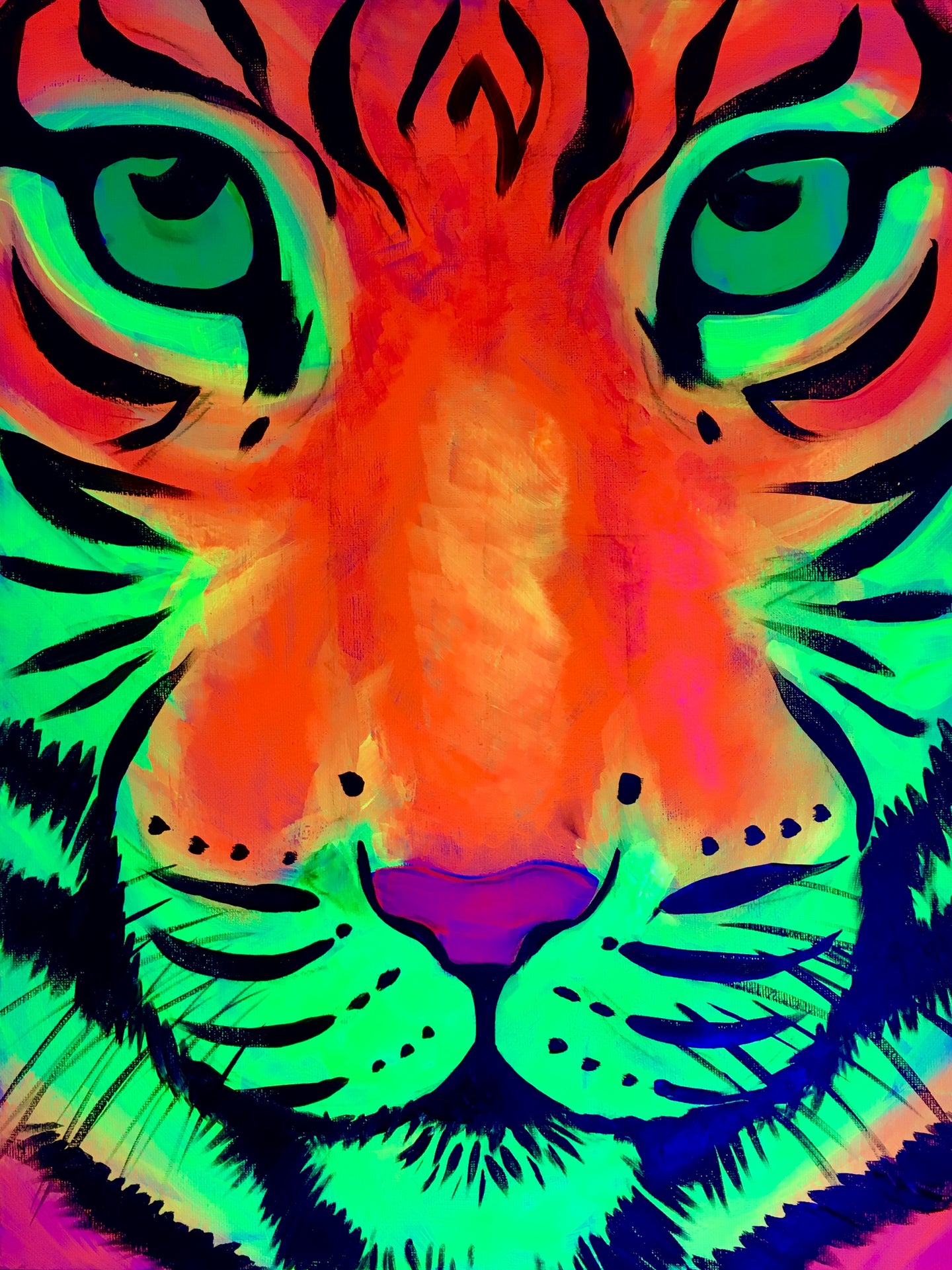 This painting depicts a close up of a tiger’s face. What kind of an expression can you give him? Inquisitive? Thoughtful? Hungry? The tigers glowing eyes make for a super fun neon painting.