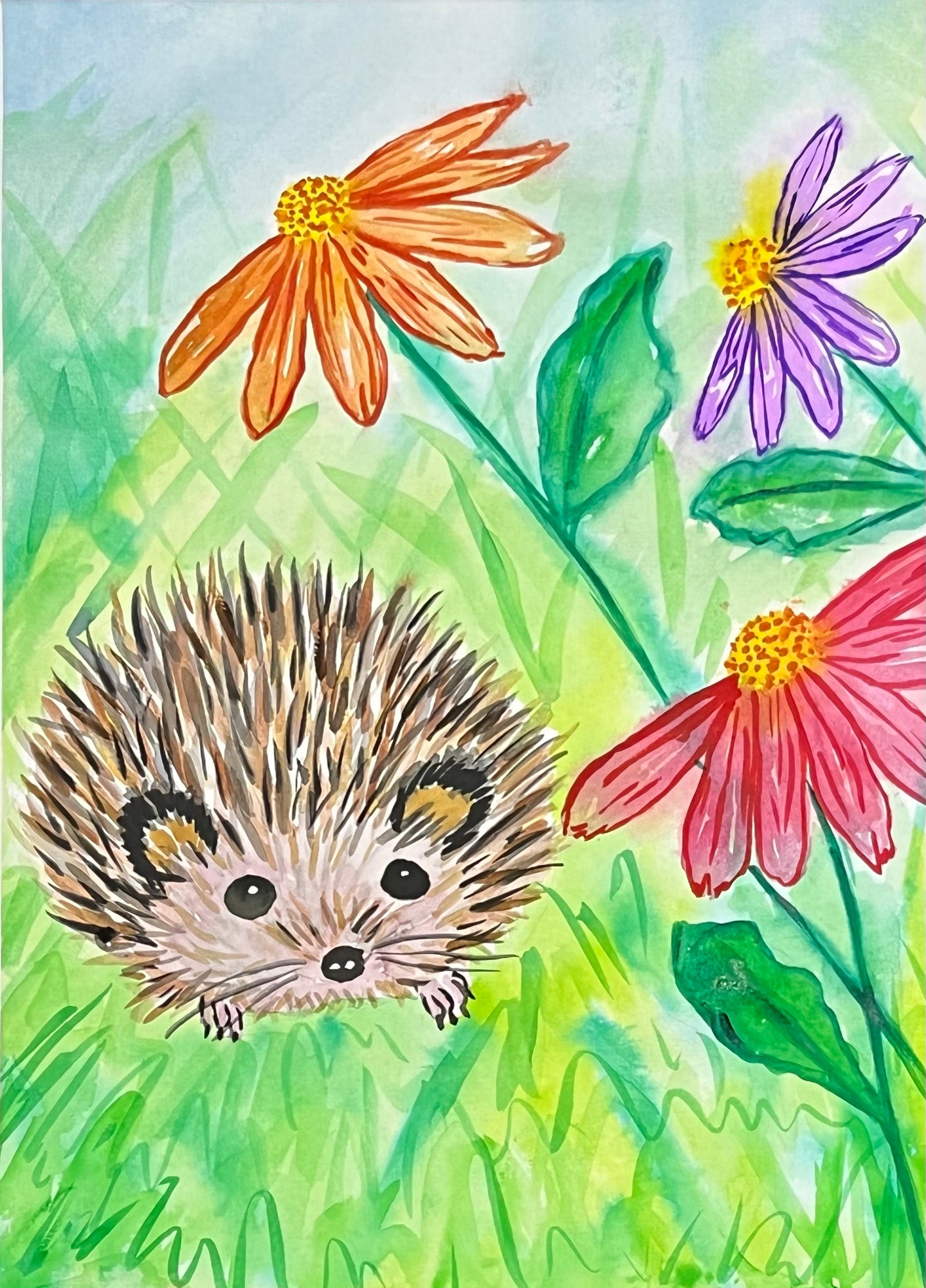 With guidance from our artist using the wet on wet technique you will create a luscious background with flowers, bringing in our friendly hedgehog to play in the grass.