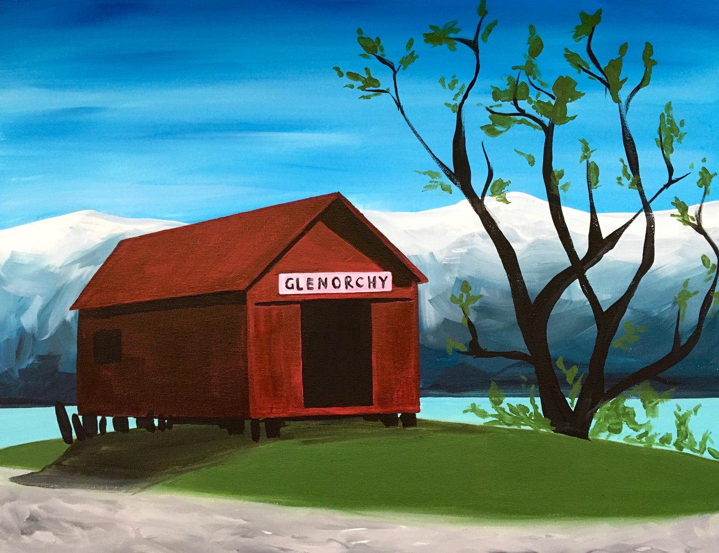 This is a view of the very famous old rail shed in Glenorchy. The painting takes you to a cold day in early spring - with leaves on the trees, but snow still on the mountains.