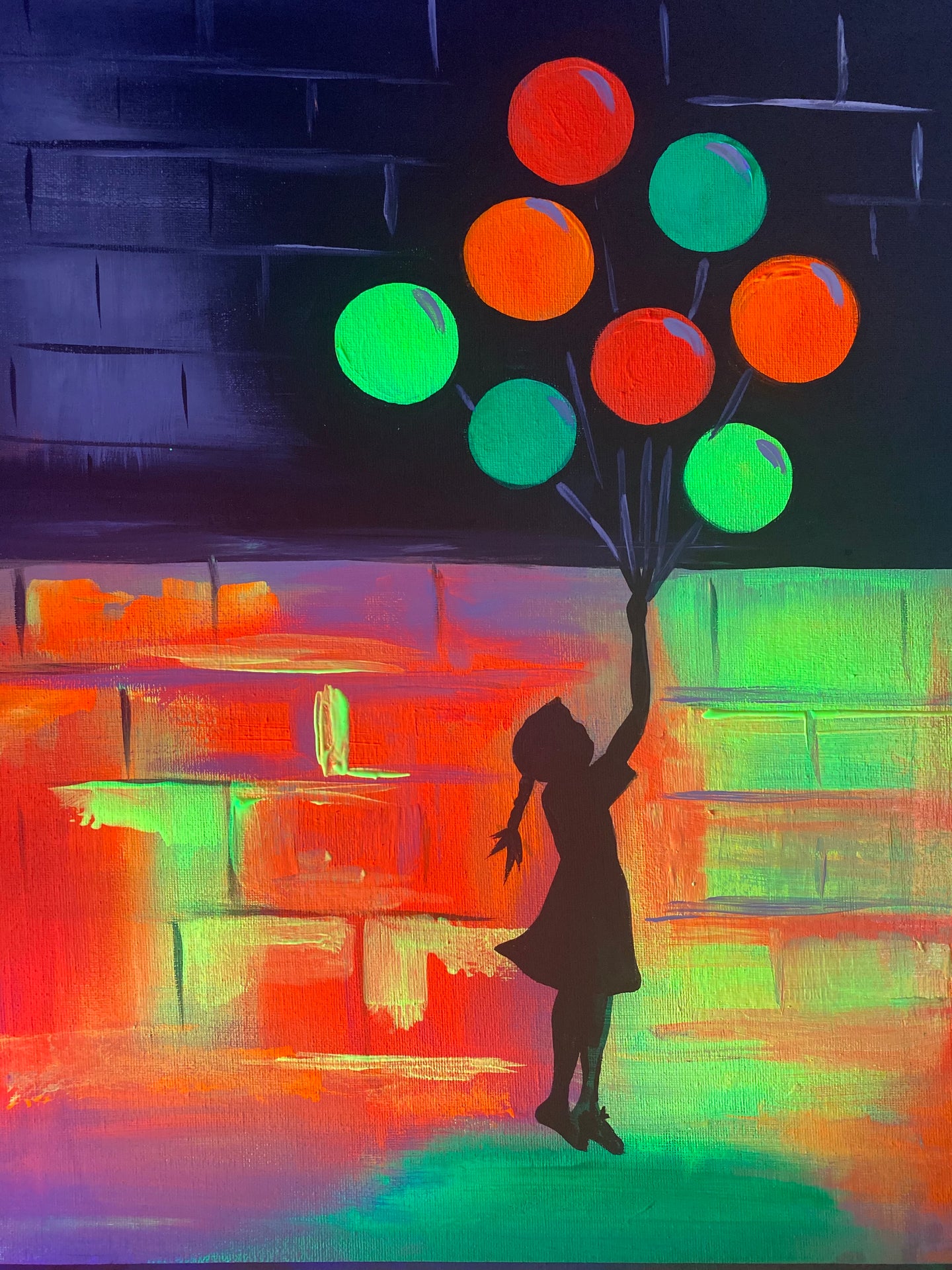This rad painting is a neon tribute to Banksy's legendary girl with a balloon. With glimmering glow-in-the-dark paint, let your imagination run wild with this modern classic.