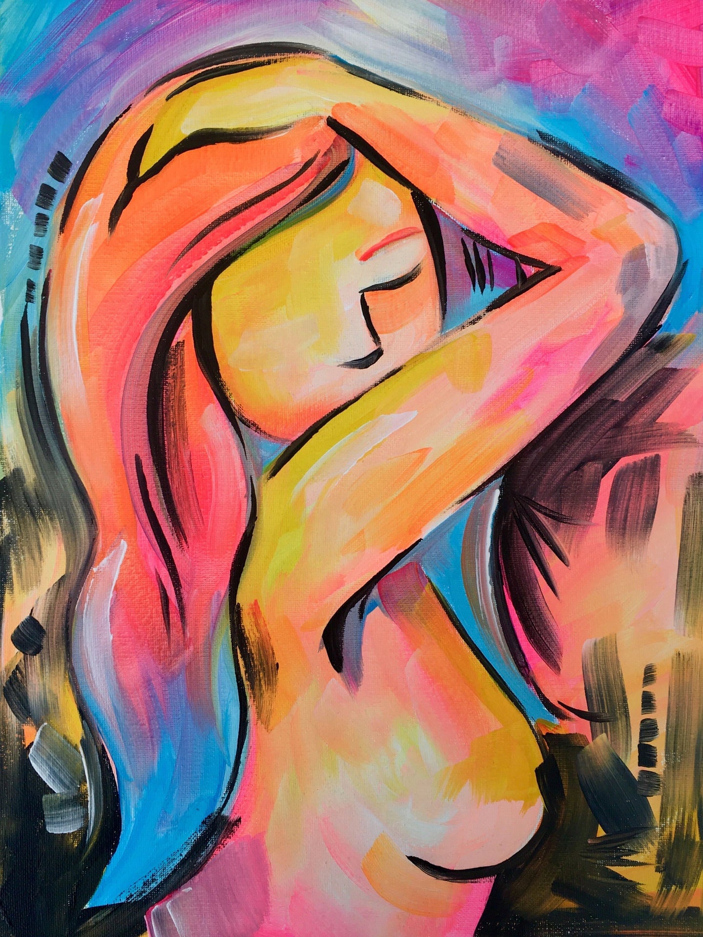 This painting of a seductive goddess captures the electric energy of neon lights and lively streets in the city outside. The dynamic brush strokes, splashes of neon pink and warm colours make it an exciting piece to paint!