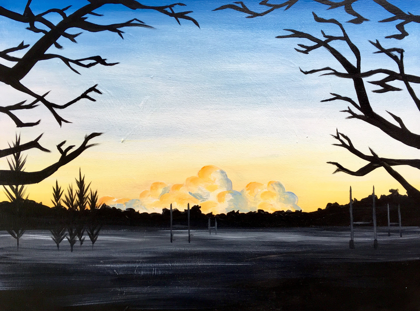 Hagley Park is the largest urban open space (164.637 hectares) in Christchurch, New Zealand. This painting captures the park on a winters morning. The silhouette branches have lost their leaves, giving it a mellow tone, but the bright happy sunny clouds contrast this feeling to make it feel beautiful and peaceful. Delicate streaks of white paint across the rugby field to mimic mist. A simple but very effective technique.