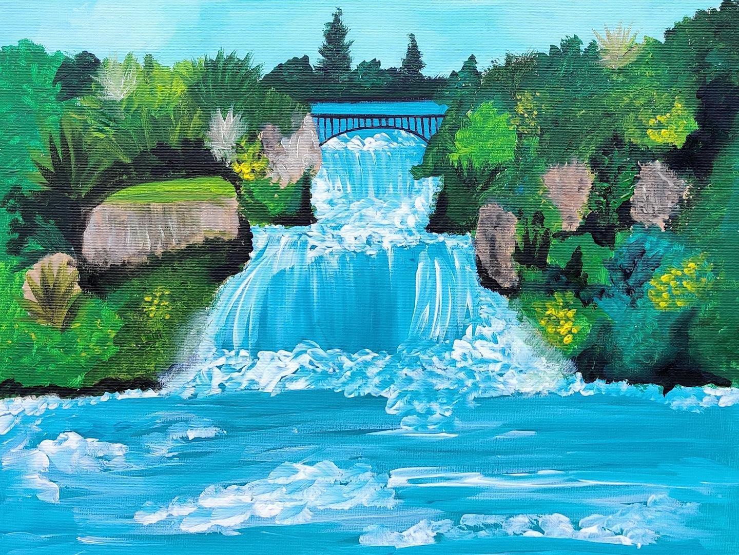 This painting uses a dabbing technique with thick white paint to create the illusion of movement and power in the water. We will also go over simple but effective techniques to create the foliage around the waterfall.