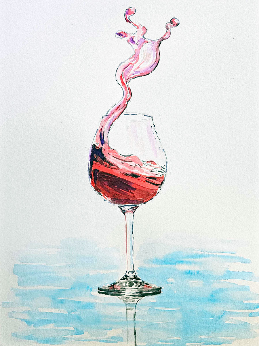 This watercolour painting of red wine sloshing in a wine glass uses simple watercolour painting techniques that are fun and mindful. This is a great painting for Hen's Do's, bridal showers - or any party!