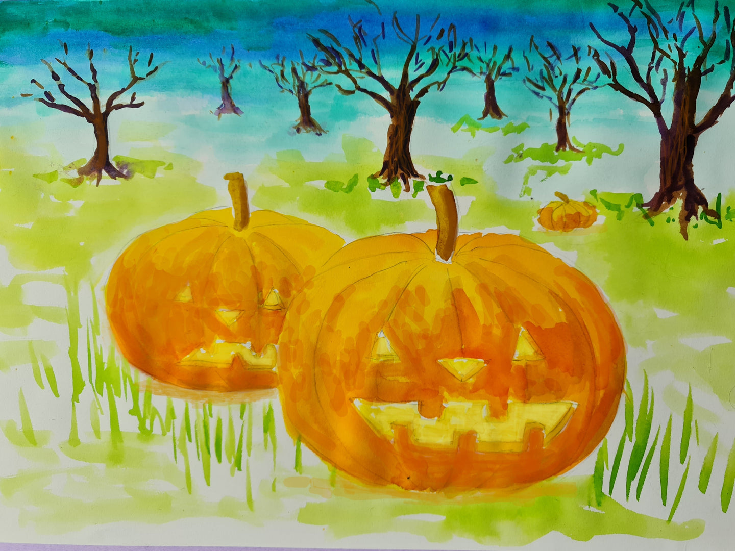 This spooky painting uses bright colours that blend together rather than having a solid horizon line. This is a nice way to merge the sky and grass to create the illusion of a wild overgrown forrest. The shadows on the pumpkins are created with overlaying the transparent watercolour paint.