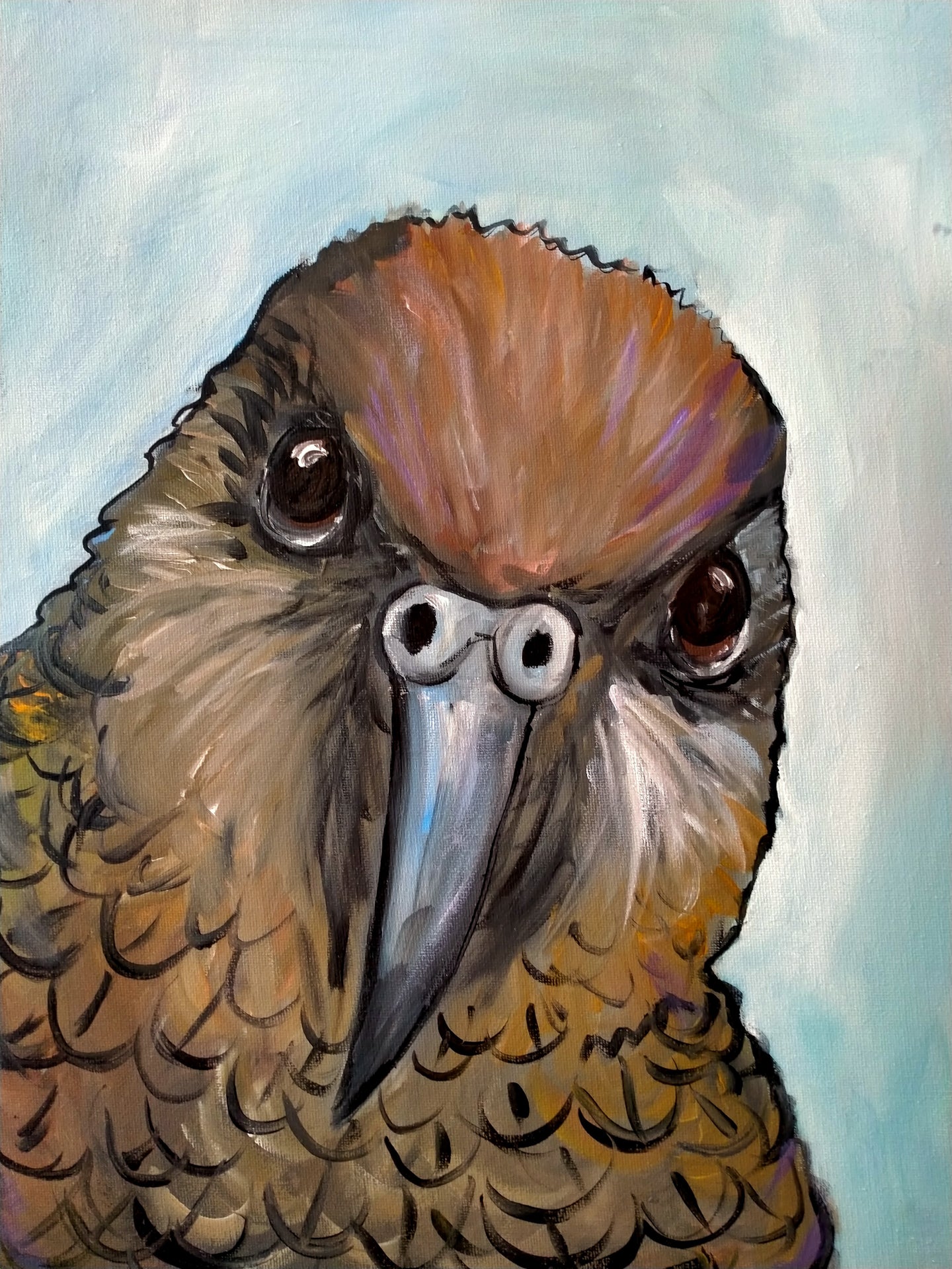 This quirky painting of a kea with a cheeky face captures the unique personality of this mischievous New Zealand parrot. The green-brown feathers of the bird are rendered with hints of bright hues, while itsinquisitive expression suggest a playful sense of humour. The curious nature of the kea is conveyed through its lively pose and piercing gaze, making for a captivating and engaging piece of artwork.