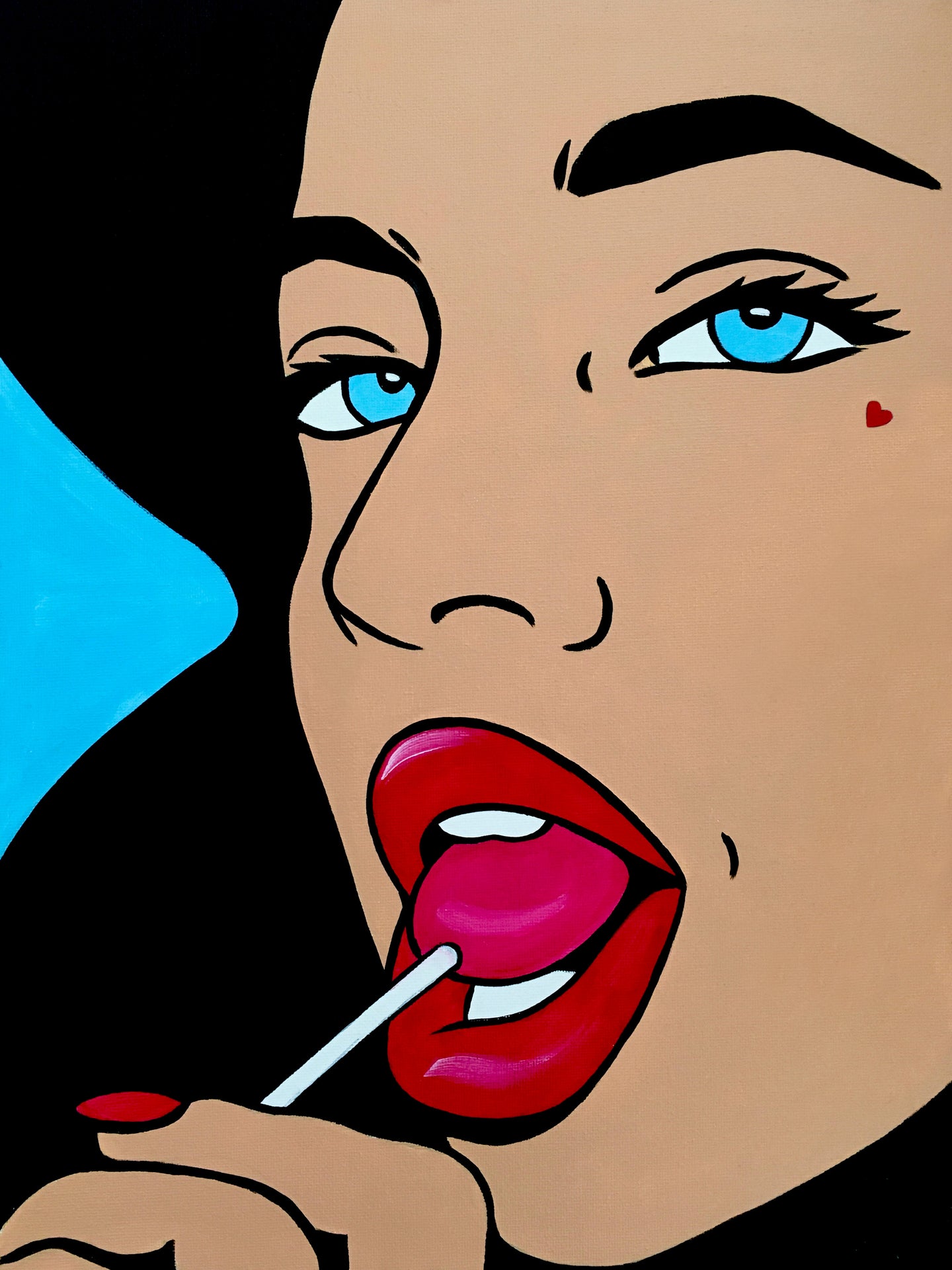 The vivid colors and bold lines characteristic of the pop art style are used to create a playful and eye-catching image. The juxtaposition of the innocent lolly pop with the suggestive pose of the lady adds a touch of cheekiness and subversion to the overall composition. This painting is made with smooth brush strokes to mimic the printmaking aesthetic of the pop art movement.