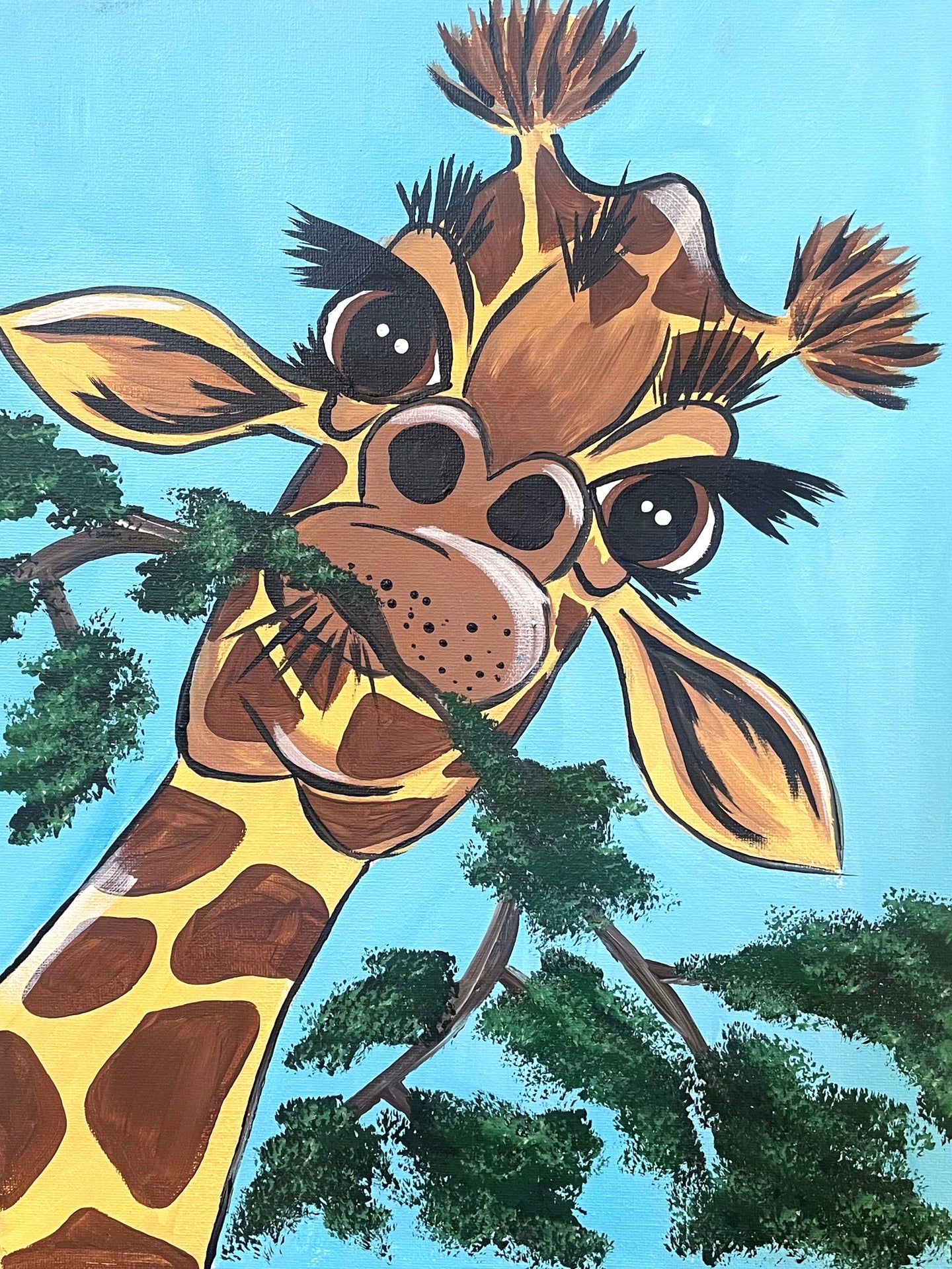 Discover the beauty of nature on canvas as you immerse yourself in the captivating scene of a serene giraffe delicately chewing on a branch adorned with deep green leaves. With a calm and inquisitive gaze, the giraffe invites you into its world while the backdrop of soft, light blue skies creates a soothing atmosphere. Let your brushstrokes bring this peaceful masterpiece to life, allowing yourself to be enchanted by the joy and wonder of painting.