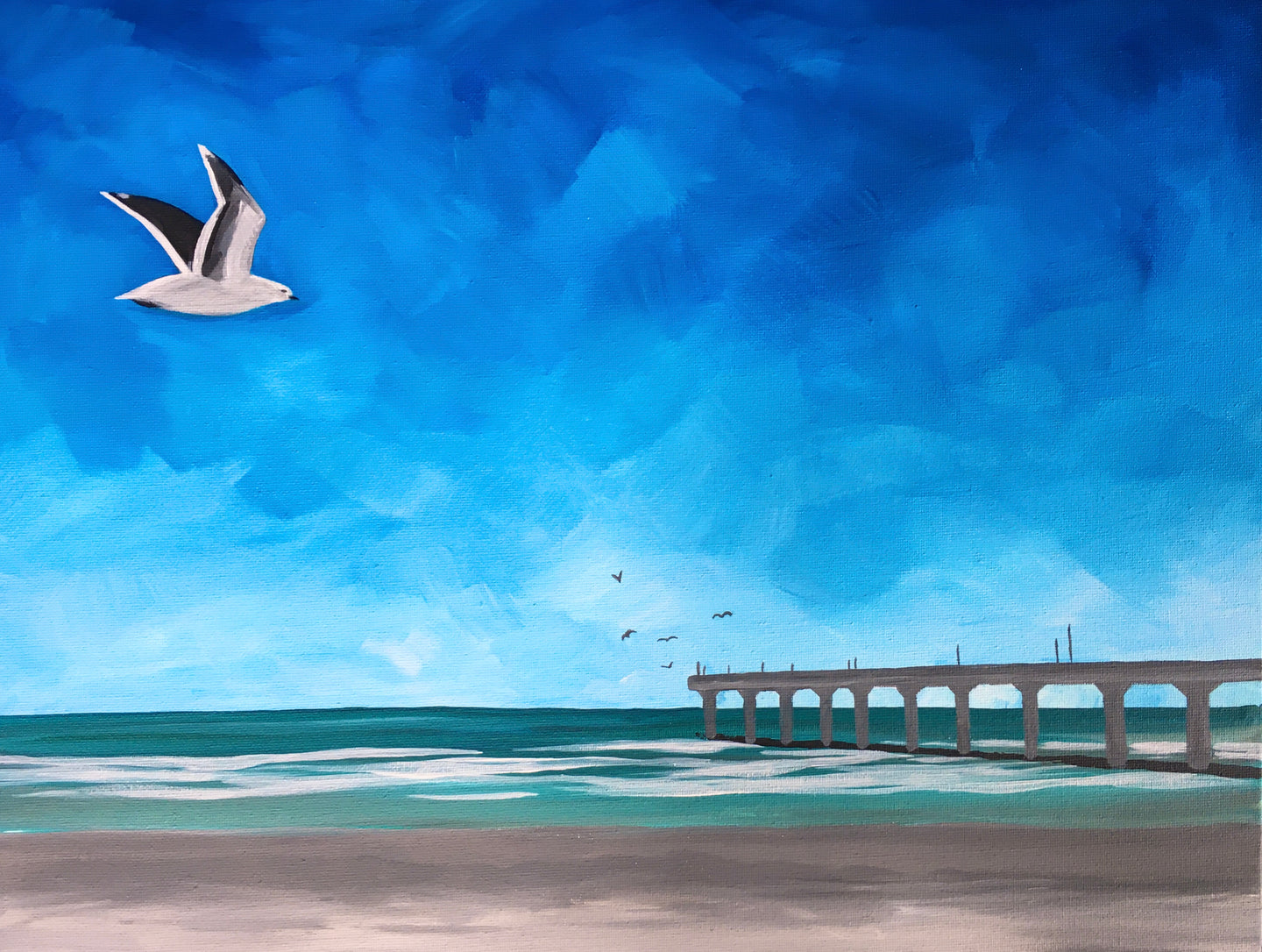 We use expressive brush strokes for the sea and sky, contrasted with a carefully painted pier and seagull.
