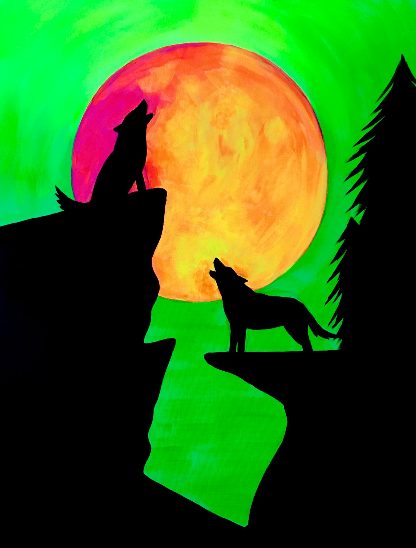 This moody painting is an eerie picture of two wolves howling at a glowing orange and pink moon, against a luminescent green sky.
