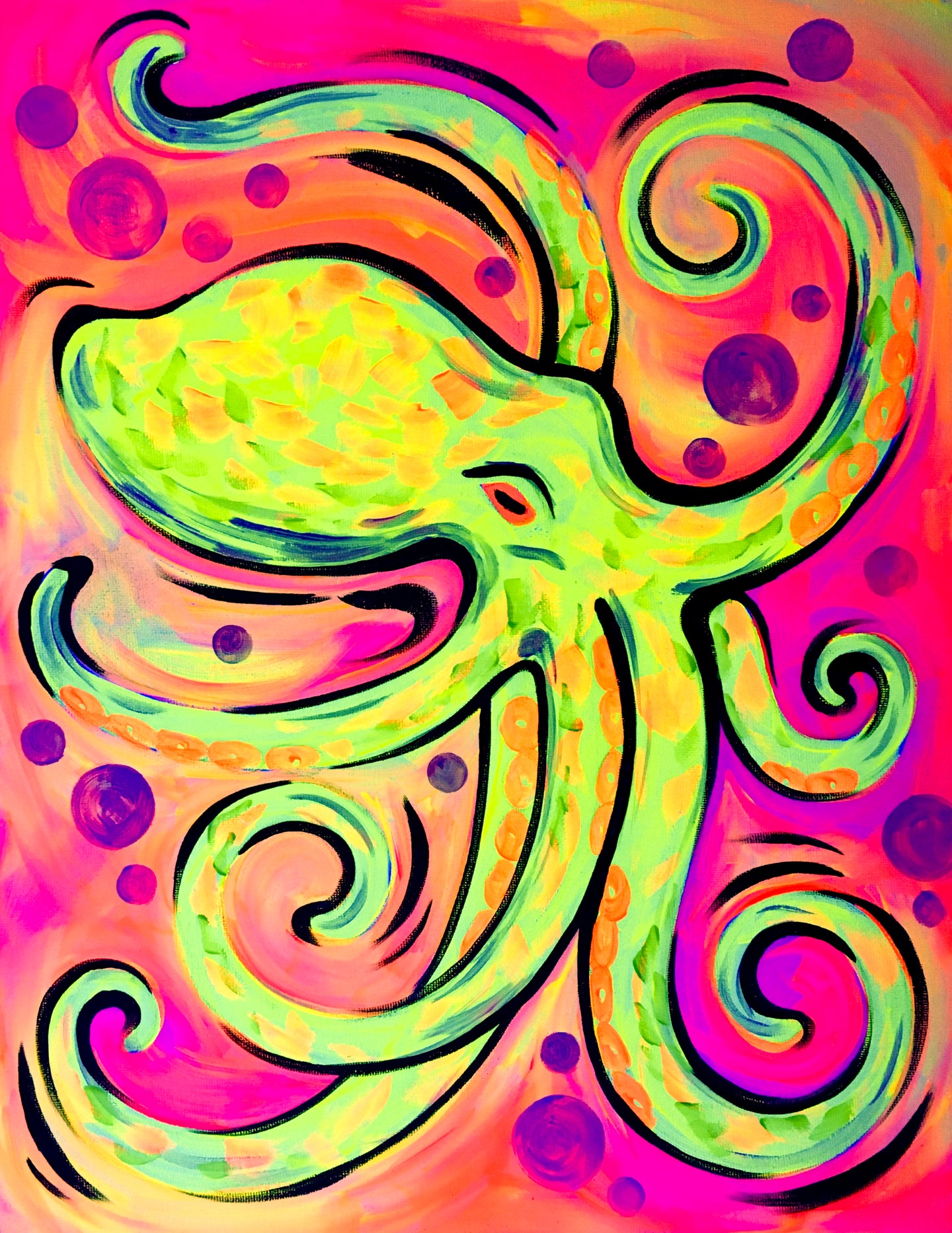 Here we have a cheeky bioluminescent octopus, dancing and frolicking around the ocean. And don't worry - the 8th arm is lurking behind him! Black lines and bubbles give this neon Octopus movement and grace.