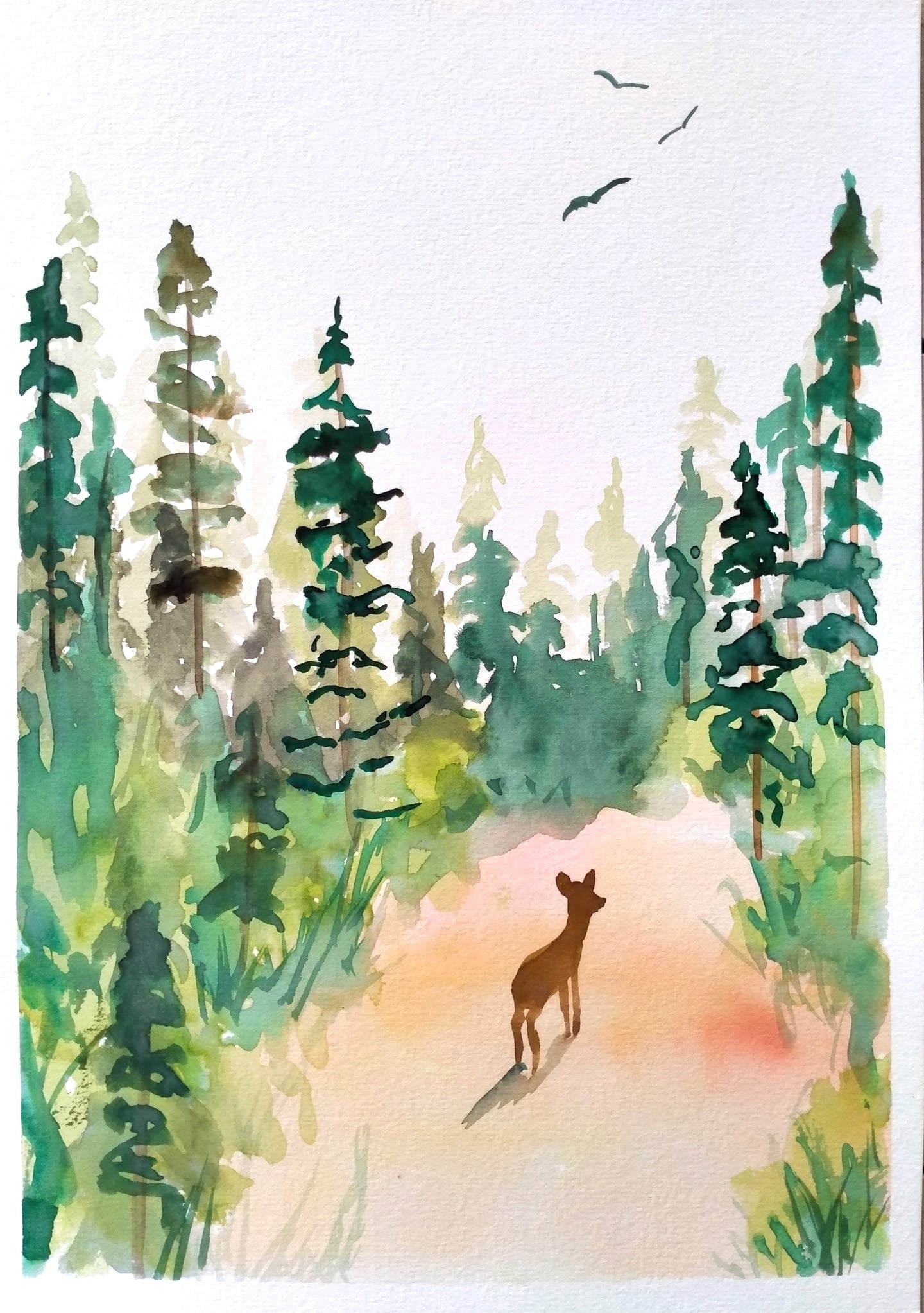 In this cute watercolour painting, a deer is strolling among the trees of a peaceful woodland. The natural green hues of the forest create a calming atmosphere, and the flowing brushstrokes and translucent colours give the scene a relaxed quality. As you create this painting, you can almost hear the gentle rustling of leaves and the quiet whispers of the forest. It is a lovely reminder of the simple joys of nature and the wonder that can be found in a moment of stillness.