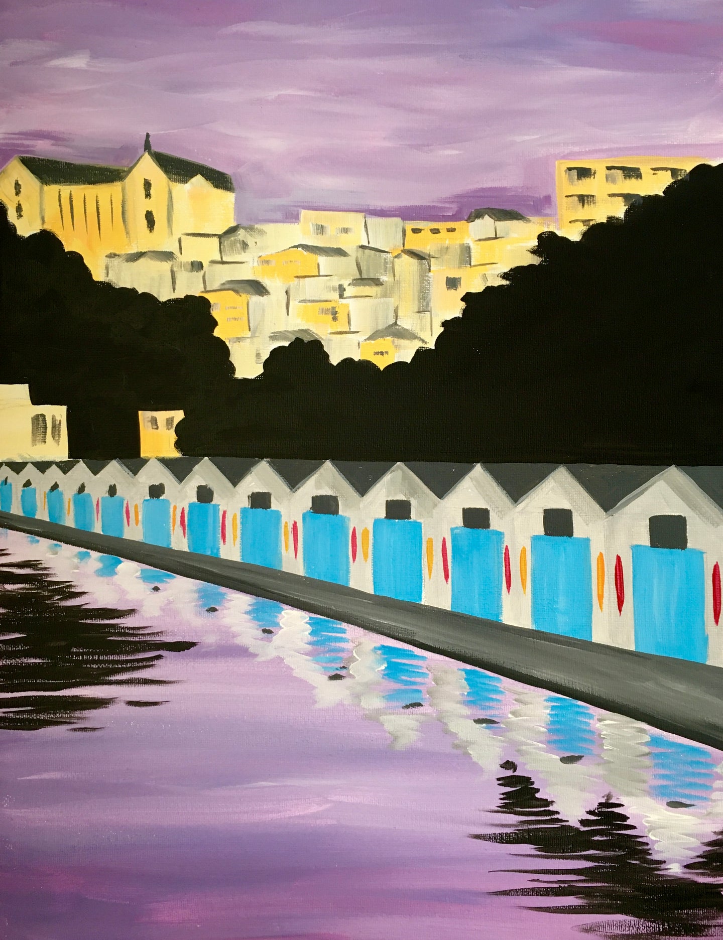 Paint this gorgeous view of the Oriental Bay boatsheds, with St Gerard's Monastery against a purple sunset!
