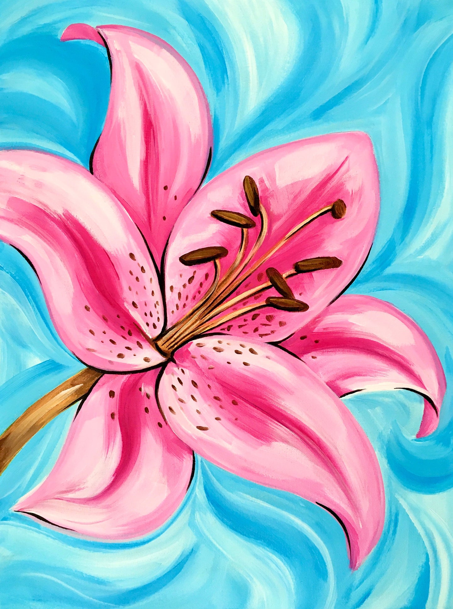 This painting of a pink lily against a bright blue sky is a stunning display of natural beauty. The delicate petals of the flower are rendered with intricate detail, while the bright, bold colour of the sky provides a vibrant backdrop. The contrast between the soft, feminine curves of the lily and the swirling blue sky creates a dynamic visual interplay, drawing the viewer's eye and inviting them to get lost in the scene.
