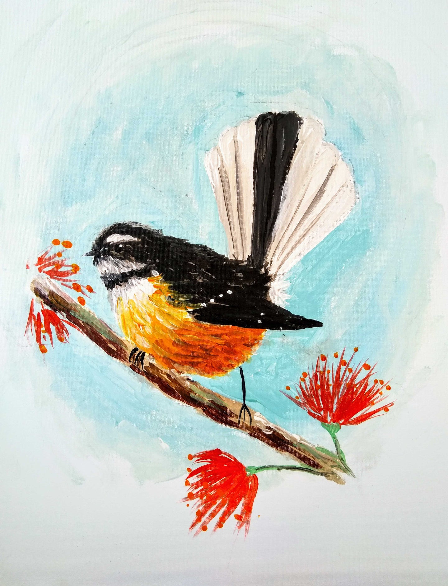Our artist will take you through step-by-step to create this delicate piece, using lots of feathery brush strokes. The carefully placed details are what makes this painting so stunning. This one is guaranteed to take your mind off all your troubles, as you focus for 2 hours on crafting your very own Pīwakawaka.
