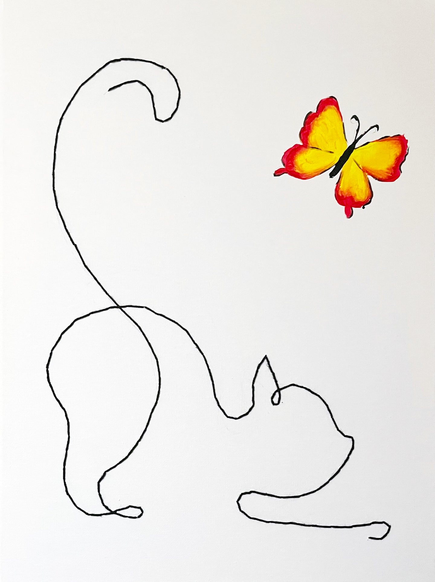 What has your cat found? With needle and thread, learn to play through stitching this playful kitty. Use your imagination to paint whatever object you envisage worthy of your cat's attention!