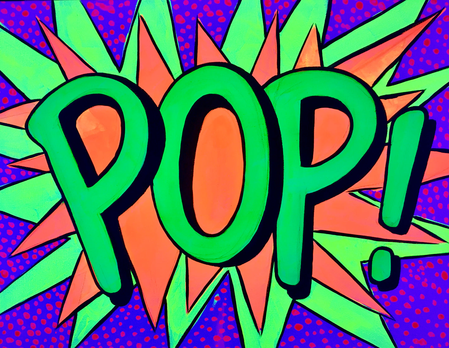 Channeling Roy Lichenstein and vintage comic books, we’re making a sound effect into an artwork. Neon paint make this painting sound brighter and louder. Glow in the dark vibe makes this painting POP!!