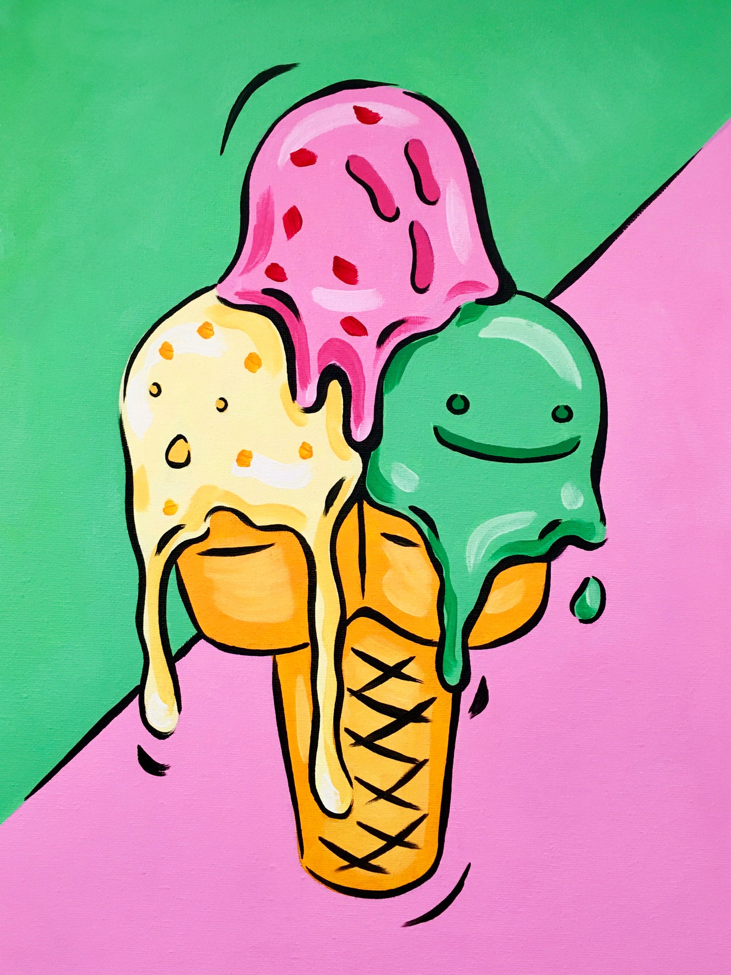 "POPlicious Scoops" is a charming and whimsical painting that features three stylised ice creams with adorable faces against a pastel green and pink background. The use of soft colors gives the painting a delicious dreamy and playful feel, while the sweet expressions on the ice creams' faces evoke a sense of joy and fun. The attention to detail in the design of the ice creams, from their bright colors to their cute features, makes "POPlicious Scoops" a delightful work of art that will surely bring a smile to anyone's face.