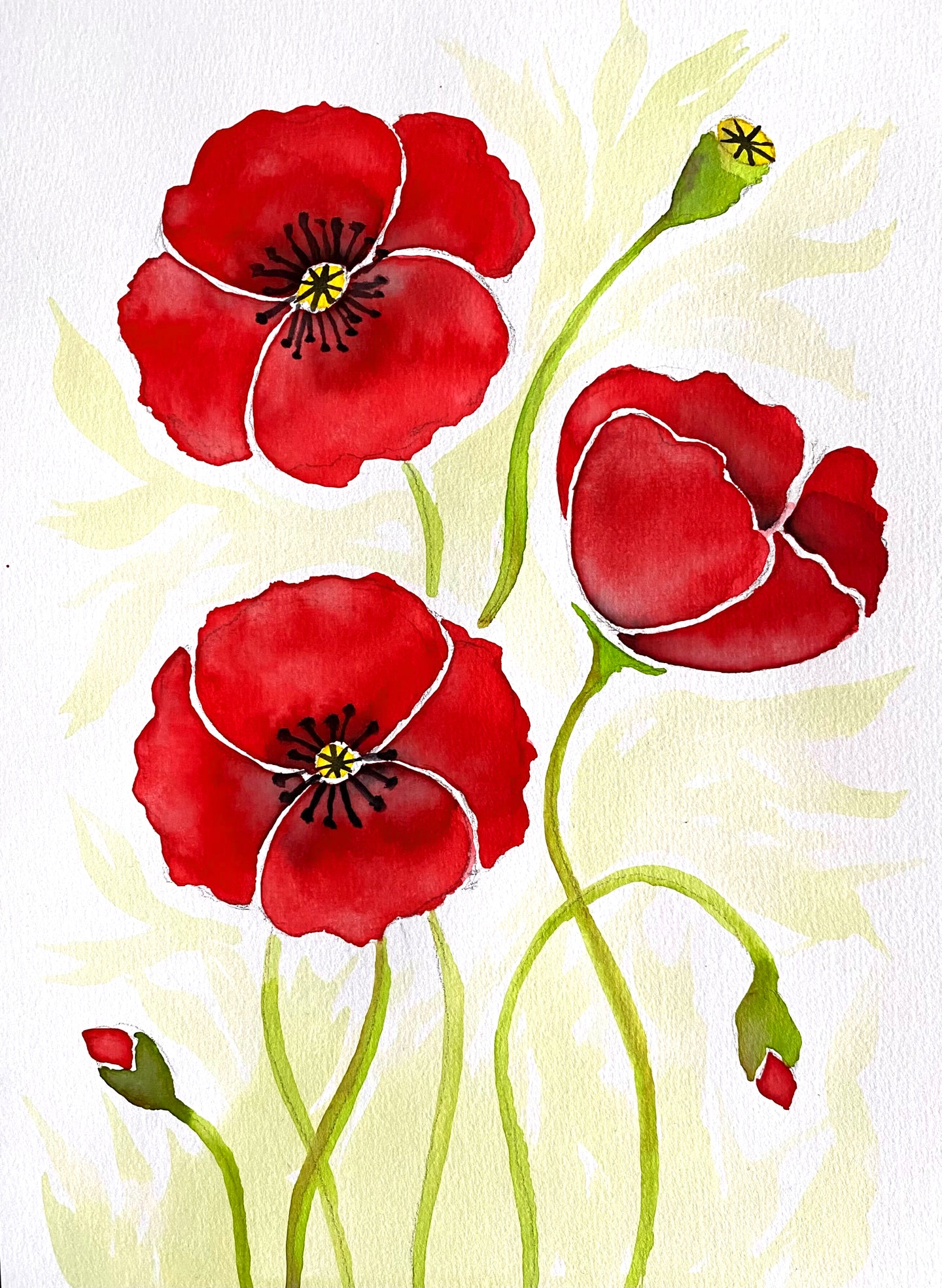 Poppies have long been known as a symbol for remembrance and hope for peace. This watercolour painting uses only a few colours, to create a beautiful floral artwork. The bold red poppies contrast nicely with the soft green background of abstract leaves. We will teach you blending techniques along with how to mix colours to get a natural looking green. This is a lovely simple piece that is fun and relaxing to paint.