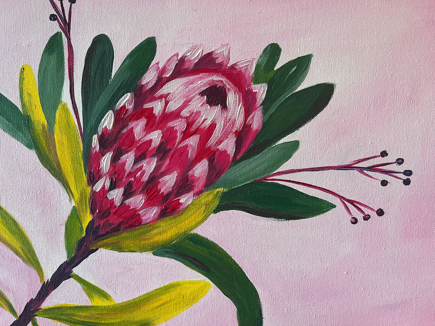 The gorgeous pink hues of this protea flower look so delicate against the soft pink background, creating a lovely painting that is lots of fun to paint! Capturing the intricate details and soft colour palette of this artwork truly makes the painting process a super fun experience.