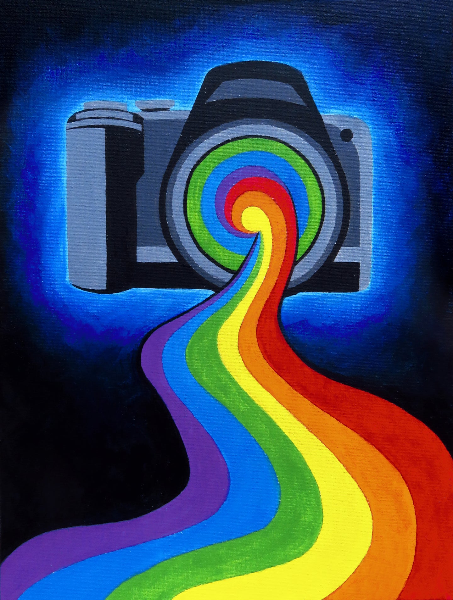 Get lost inside this colourful swirling painting! With smooth brush strokes and careful blending, you will create this playful painting while chatting to your neighbour. Lovely and bright, this one is sure to add some happiness to your walls! The camera lens captures the rainbow of colours all around us. Join us in creating rainbow lens and watch the colours at they tumble from your new camera. Perfect for those who like geometric forms.