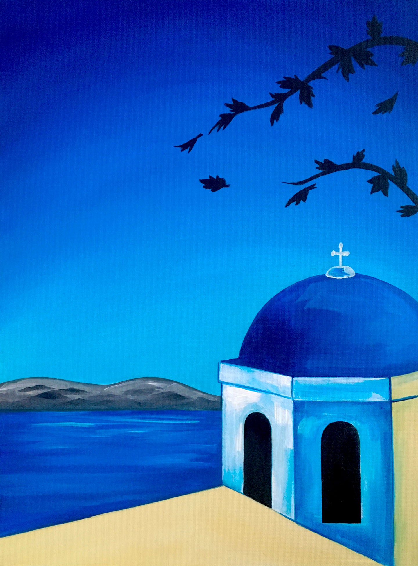 This is a wiew of the famous blue-domed church in Santorini, with the Aegean sea in the background and some grape vines silhouetted in the upper right corner. In this painting, we use geometric shapes and smooth blending techniques.