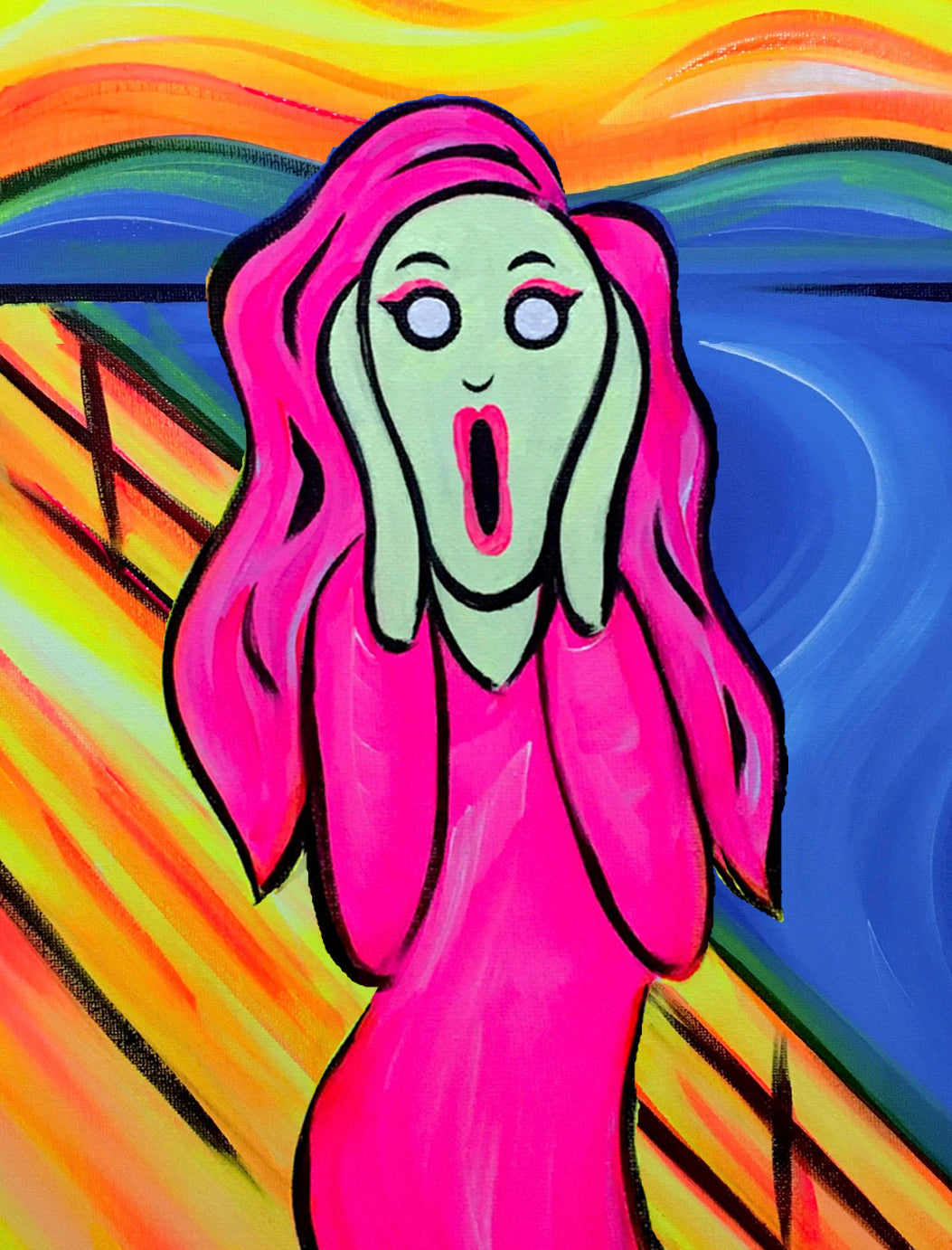 A neon take on the famous painting 'The Scream' by Edvard Munch. This is a brightly coloured version of The Scream, featuring a drag queen inspired main character. Drama Queen anyone?