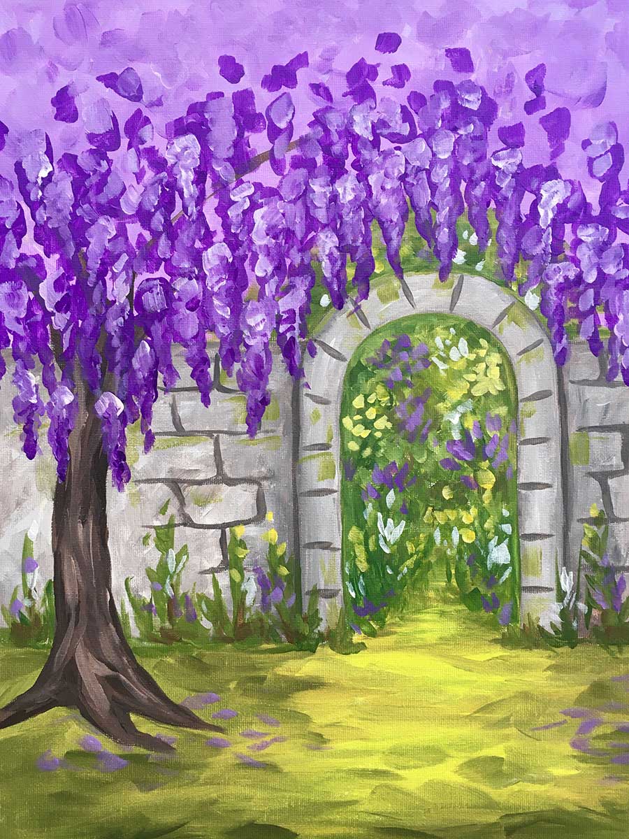 Step into a world of wonder with this magical painting of a secret garden. A majestic tree with cascading purple foliage frames an inviting hidden door, hinting at the mystery beyond. Soft brushstrokes and rich colours bring this enchanting scene to life—perfect for those who love a touch of fantasy in their art!