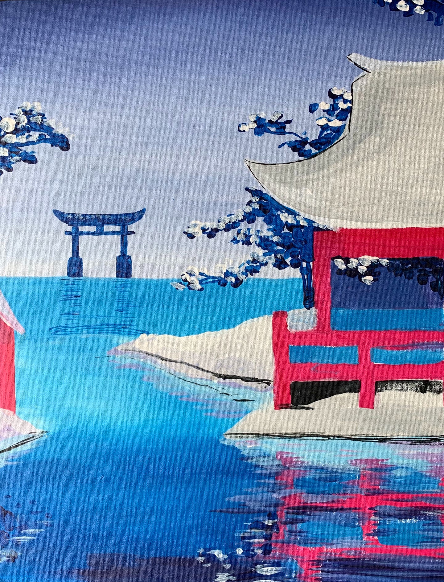 With cool blue and red/pink tones contrasting with fresh white and grey, this wintery painting is ... pretty cool! You will learn how to blend colours into a smooth gradient, and tricks of the trade to paint finer details. Over all this is a very mindful painting of a snowy scene in Japan, that is calming to paint.