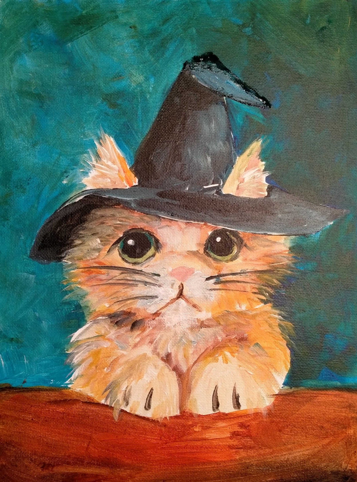 A Halloween themed painting of a cute kitty in a witches hat. We use lots of layers of small feathery brush strokes to create the fur. Abstract teal coloured background. A very impressive painting created with simple painting techniques. Great painting for cat lovers and anyone wanting to learn the basics of painting fur!