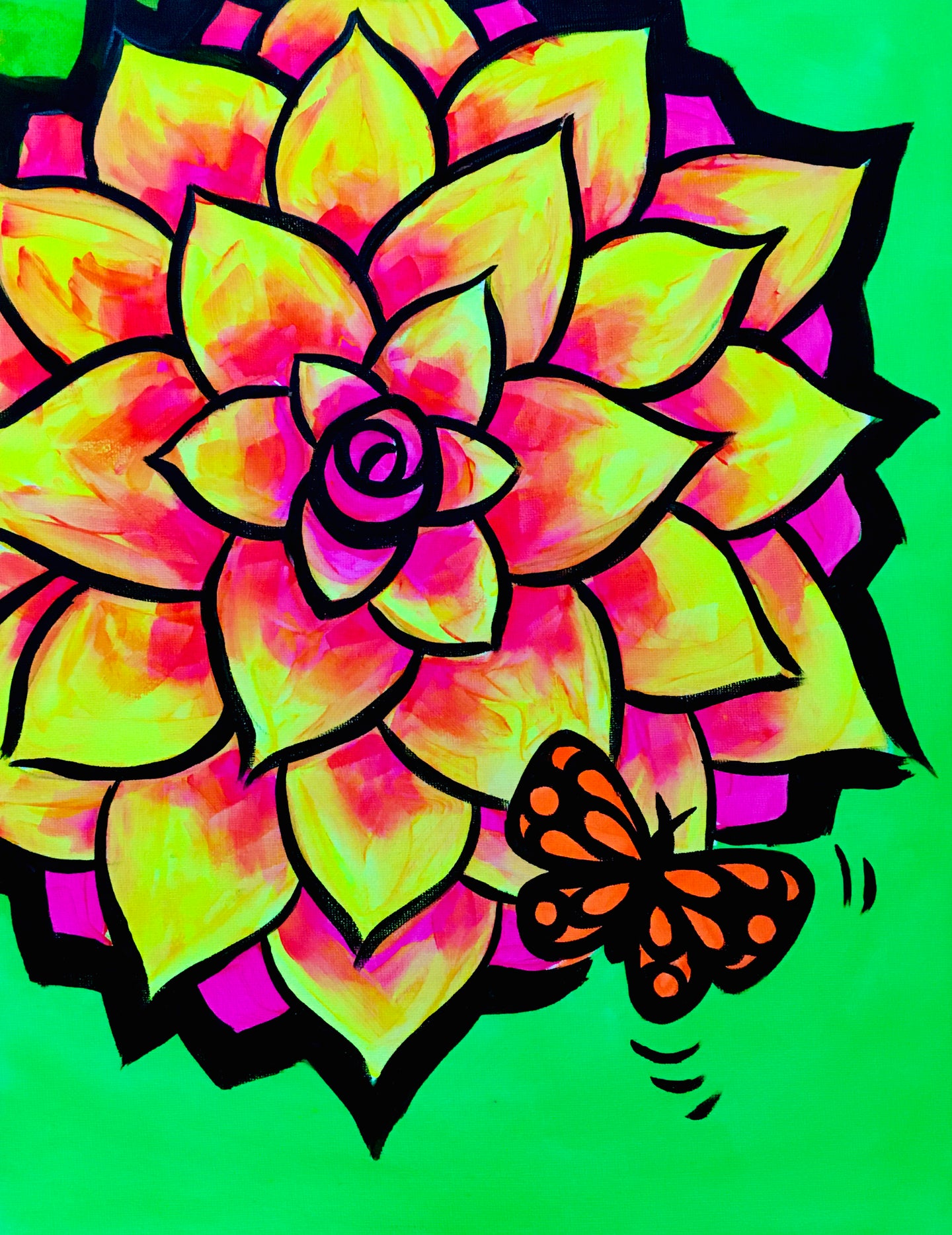 This is a picture of a succulent plant as seen from the top, with a small butterfly fluttering around. Glowing succulent is attracting the butterly with it's glowing neon colour.