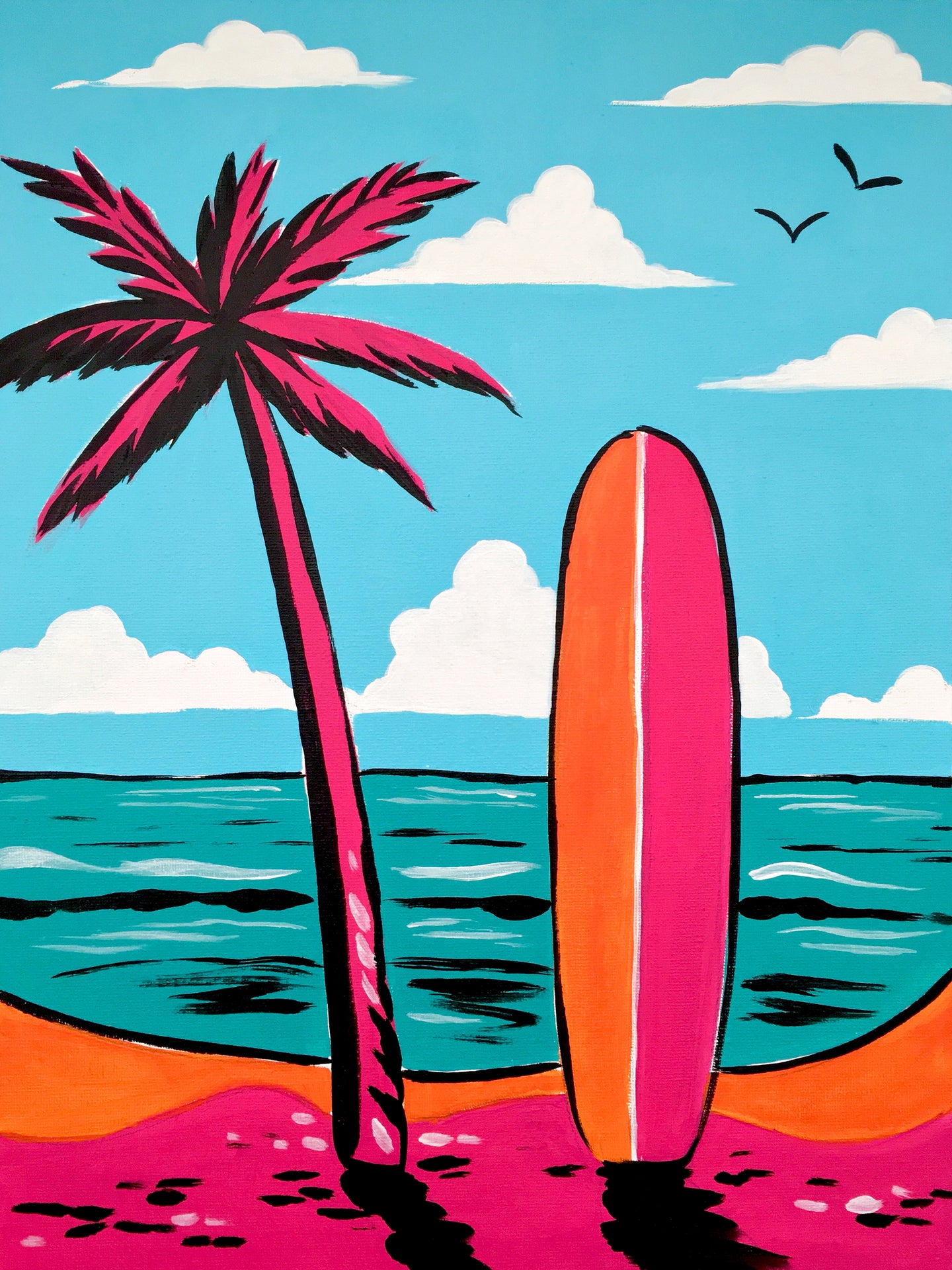 Paint our cool as 'Surf's Up!' Pop Art masterpiece, where bold 60s and 70s colours bring a retro surfboard to life on a sun-kissed beach. Dive into a world of creativity, where every brushstroke is a celebration of fun and artistic expression.
