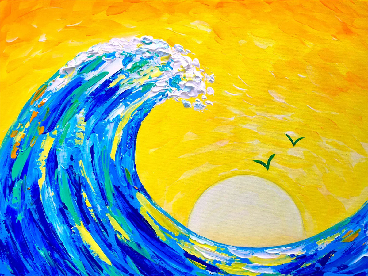 This painting promises a creative adventure where you'll master palette knife techniques and textured paint to form a vibrant, 3D wave in rich blues against a sunny yellow sky. Capture the warmth of a setting sun and the sparkling reflections on the water, bringing your artwork to life with depth and color.