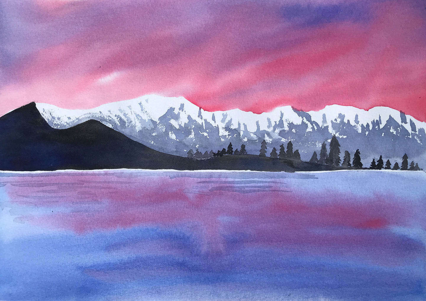 This painting of the Remarkables uses wet on wet, wet on dry and dry brushing techniques. Our customers have lots of fun learning how to get the paints blending by moving around the paintings and pouring off excess water. The original Ngāi Tahu inhabitants called the mountains Kawarau, and gave the same name to the Kawarau River which starts beneath them.