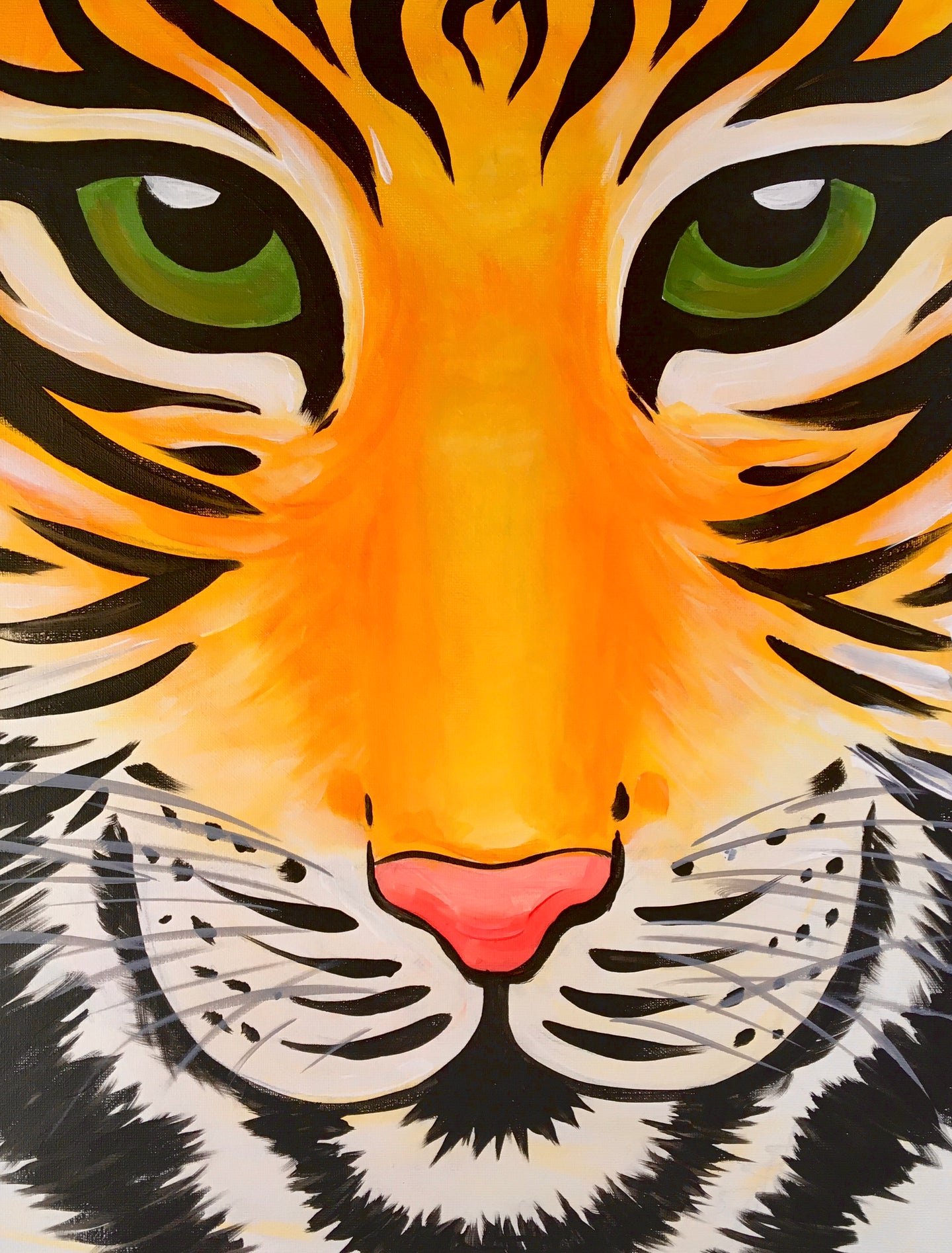 This is a super fun painting a tiger's face - but close up! This painting is bold and about symmetry. We have deep green eyes and golden orange fur, with black stripes that frame the painting. Have some fun, add some eyelashes or vary up the stripes to create your own unique version!