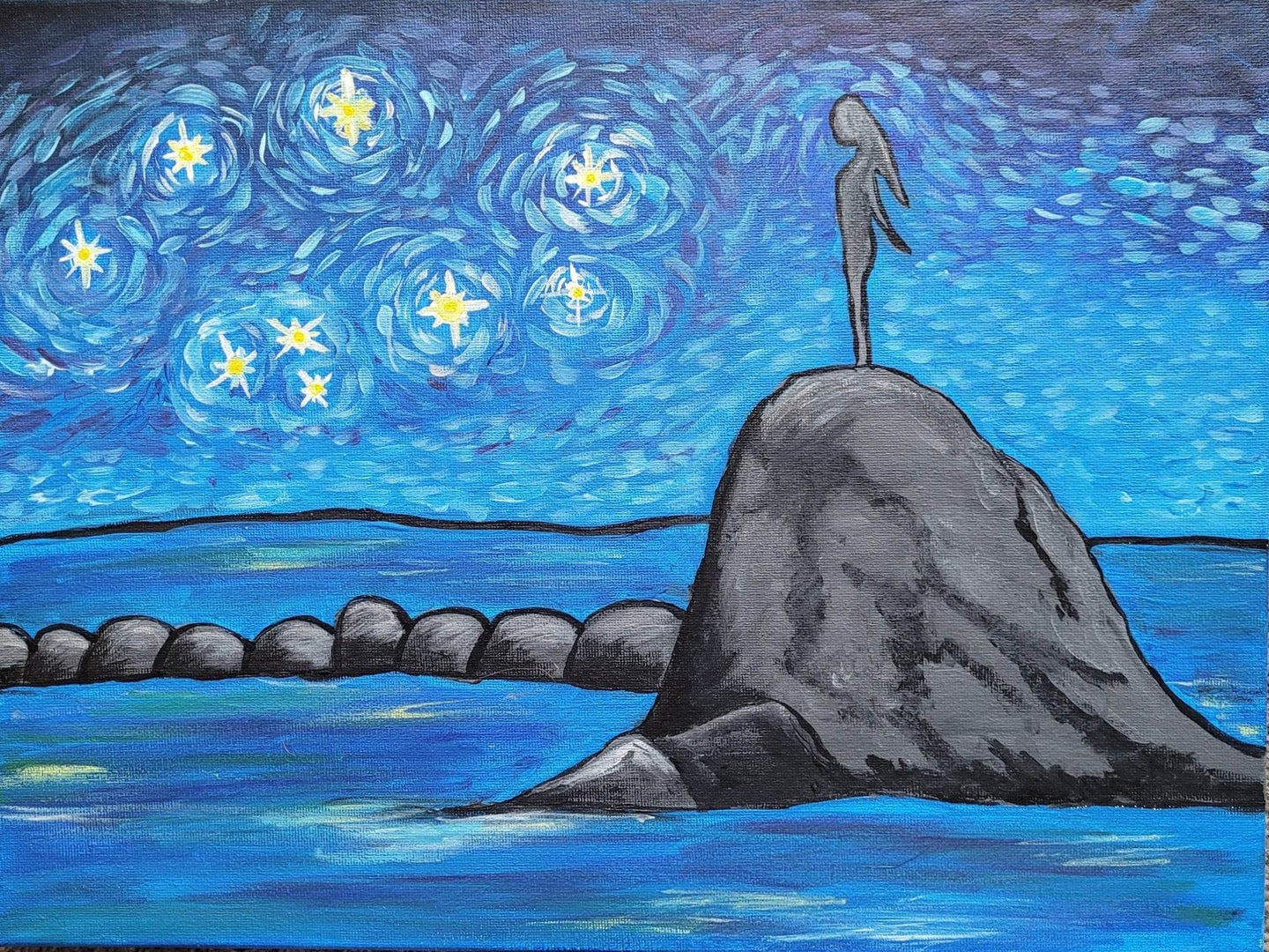 The impressive bronze statue stands atop Turuturu Rock, positioned at the mouth of the Whakatāne River, and serves as a memorial to Wairaka, the courageous daughter of Toroa, who was the captain-navigator of the Mataatua waka. By employing van Gogh-inspired swirling brush strokes, this painting aims to capture the essence of the original artwork, resulting in an enjoyable and visually stunning creation.