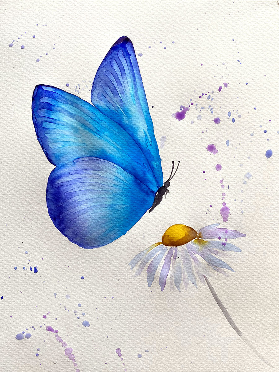 Capture the delicate beauty of a deep blue butterfly with soft hints of purple, gently hovering above a daisy in this watercolour painting. Learn simple watercolour techniques to bring your own graceful version of this scene to life. Perfect for a relaxing and creative experience!
