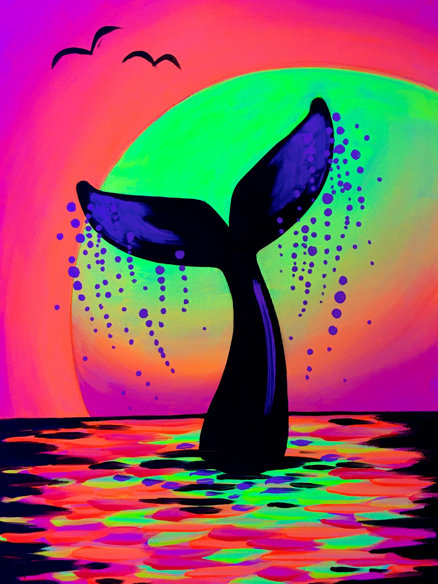 This mesmerising painting captures the ethereal beauty of a whale tail emerging from the shimmering waters, created using glow-in-the-dark paint. The painting depicts a whale's powerful tail, breaking the surface of the dark and mysterious ocean, surrounded by swirling currents of glowing orange, pink and green. The use of glow-in-the-dark paint creates a sense of magic and wonder, as if the painting is coming alive in the dark. The painting reminds us of the majestic creatures of the sea, and the beauty that lies beneath the surface.