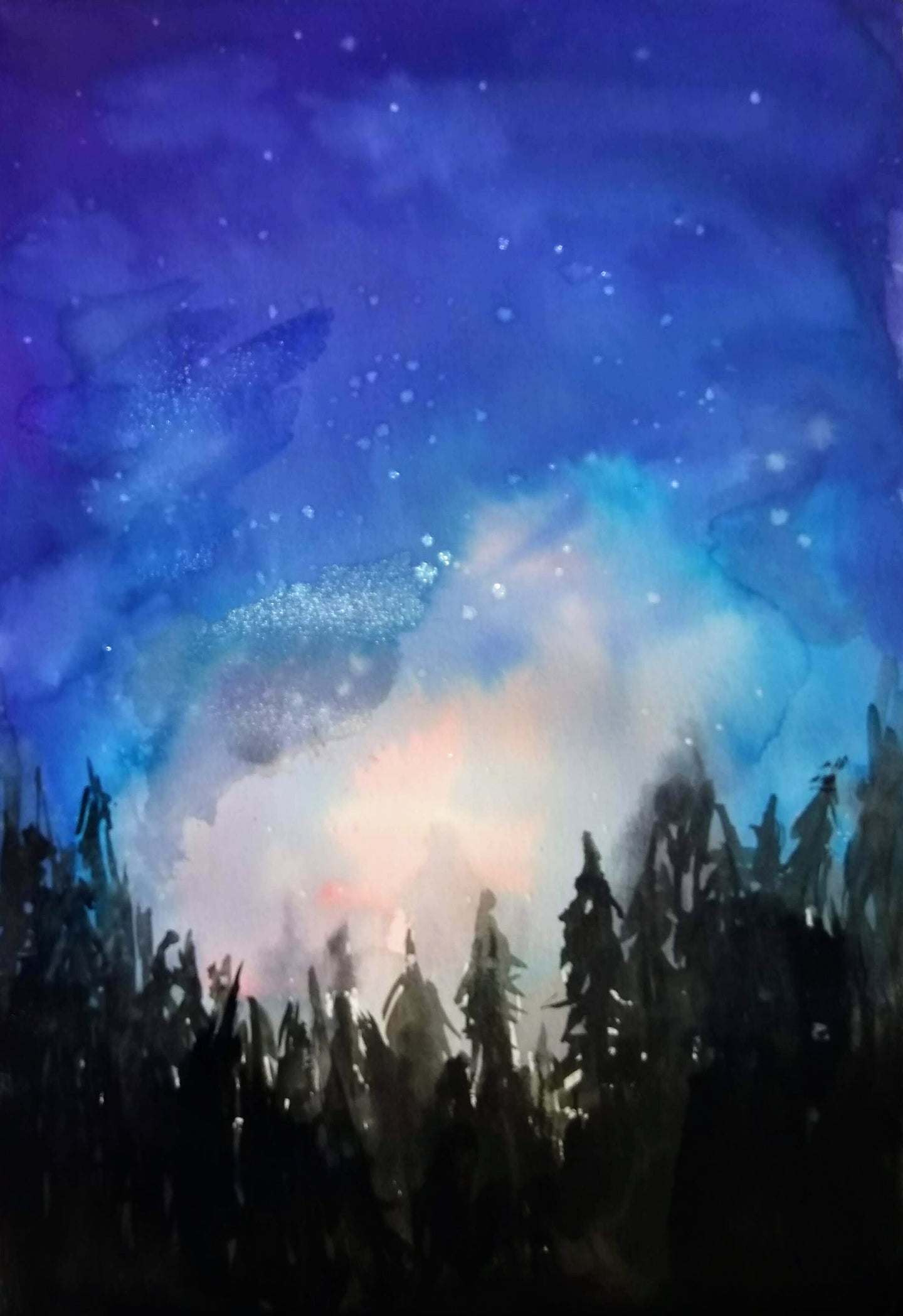 This painting requires you to go with the flow! The sky looks better the less you try to control the paint, and the more you let it do it's thing! A really nice addition to your walls, with the blue and pink wintery tones. We use white paint to create the stars, which is unusual for watercolour painting to use white - but in this instance it works a treat.