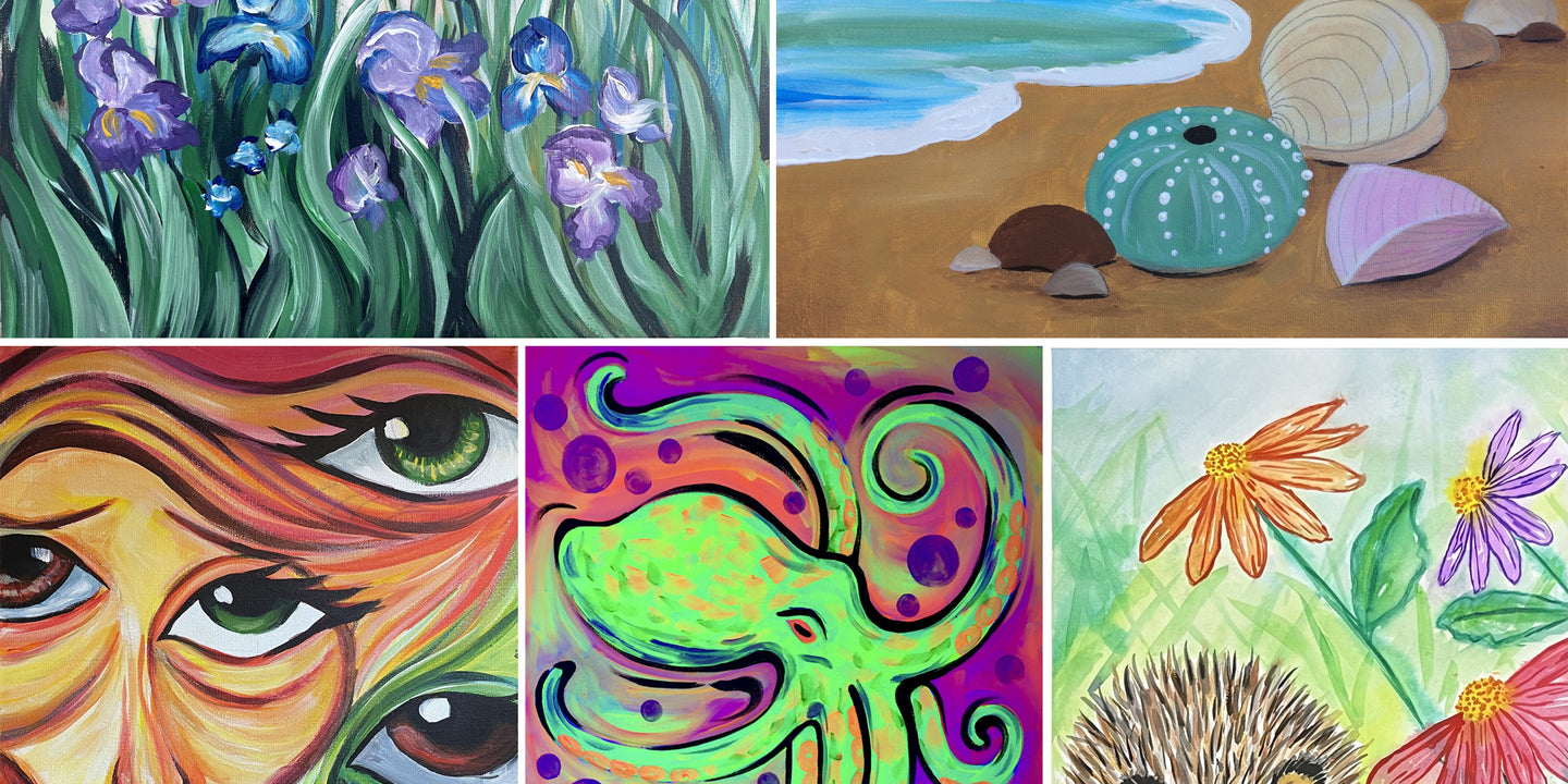 We are super excited to paint some Iris flowers, seashells on the shore, abstract faces, a funky glow in the dark octopus and a cute friendly hedgehog with you this April & May!